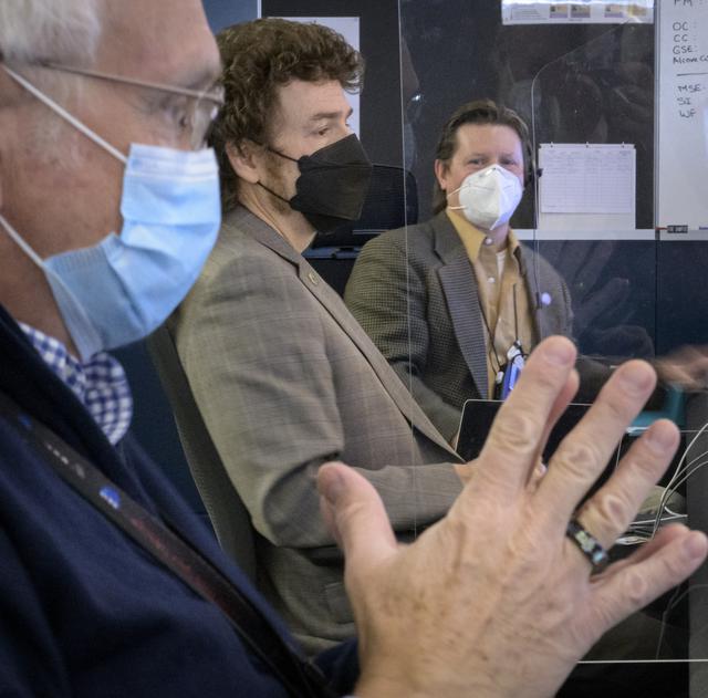 NASA James Webb Space Telescope Mission Operations Engineer Kenny McKenzie, background, NASA James Webb Space Telescope Mission Operations Manager Carl Starr, middle, and NASA James Webb Space Telescope Project Manager Bill Ochs, monitor the progress of the Webb observatory as it’s second primary mirror wing is prepared to rotate into position, Saturday, Jan. 8, 2022, from NASA’s James Webb Space Telescope Mission Operations Center at the Space Telescope Science Institute in Baltimore. Webb, an infrared telescope with a 21.3-foot (6.5-meter) primary mirror, was folded up for launch and underwent an unprecedented deployment process to unfold in space. As NASA's next flagship observatory, Webb will study every phase of cosmic history—from within our solar system to the most distant observable galaxies in the early universe. Photo Credit: (NASA/Bill Ingalls)