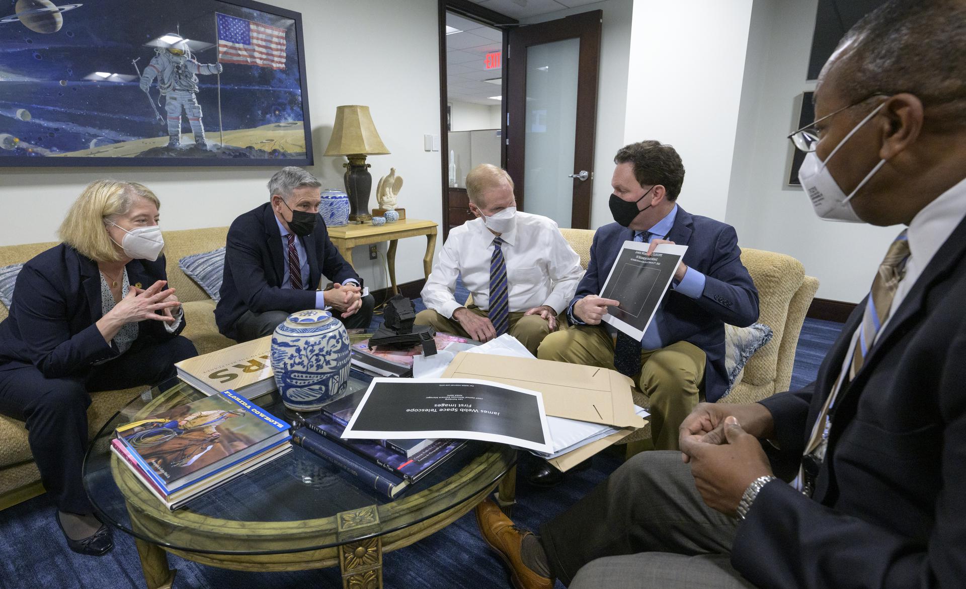 NASA Deputy Administrator Pam Melroy, left, NASA Associate Administrator Bob Cabana, and NASA Administrator Bill Nelson are shown an early mirror alignment image from the James Webb Space Telescope, by NASA Webb Optical Telescope Element Manager Lee Feinberg, as NASA Program Director for the James Webb Space Telescope Program Greg Robinson, right, looks on, Monday, Feb., 7, 2022, at the Mary W. Jackson NASA Headquarters building in Washington. This engineering visual, which features 18 unfocused dots of light, demonstrates that the Webb team has successfully identified starlight through each of Webb’s 18 hexagonal mirror segments – the starting point in a months-long process to progressively align the segments into a single, precise mirror to prepare the telescope for science. Photo Credit: (NASA/Bill Ingalls)