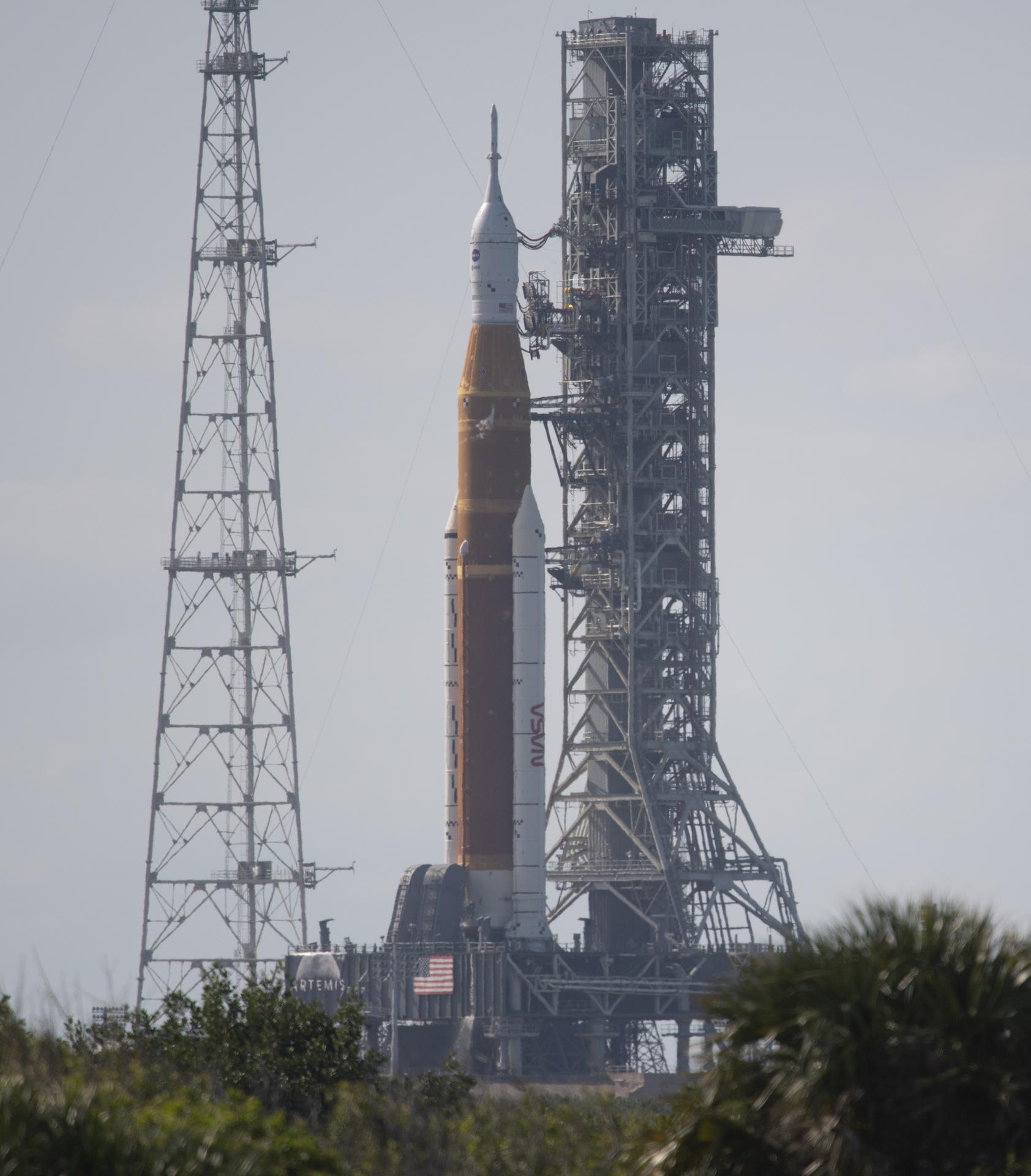 NASA’s Space Launch System (SLS) rocket with the Orion spacecraft aboard is seen atop a mobile launcher at Launch Complex 39B, Monday, April 4, 2022, as the Artemis I launch team conducts the wet dress rehearsal test at NASA’s Kennedy Space Center in Florida. Ahead of NASA’s Artemis I flight test, the wet dress rehearsal will run the Artemis I launch team through operations to load propellant, conduct a full launch countdown, demonstrate the ability to recycle the countdown clock, and drain the tanks to practice timelines and procedures for launch. Photo Credit: (NASA/Joel Kowsky)