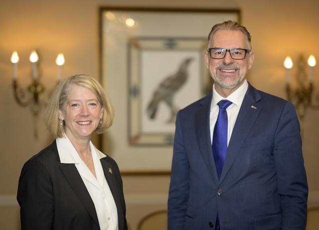 NASA Deputy Administrator Pam Melroy, left, and Dr. Josef Aschbacher, Director General, European Space Agency (ESA), pose for a photograph prior to starting at meeting during the 37th Space Symposium, Tuesday, April 5, 2022, in Colorado Springs, Colorado. Photo Credit: (NASA/Bill Ingalls)