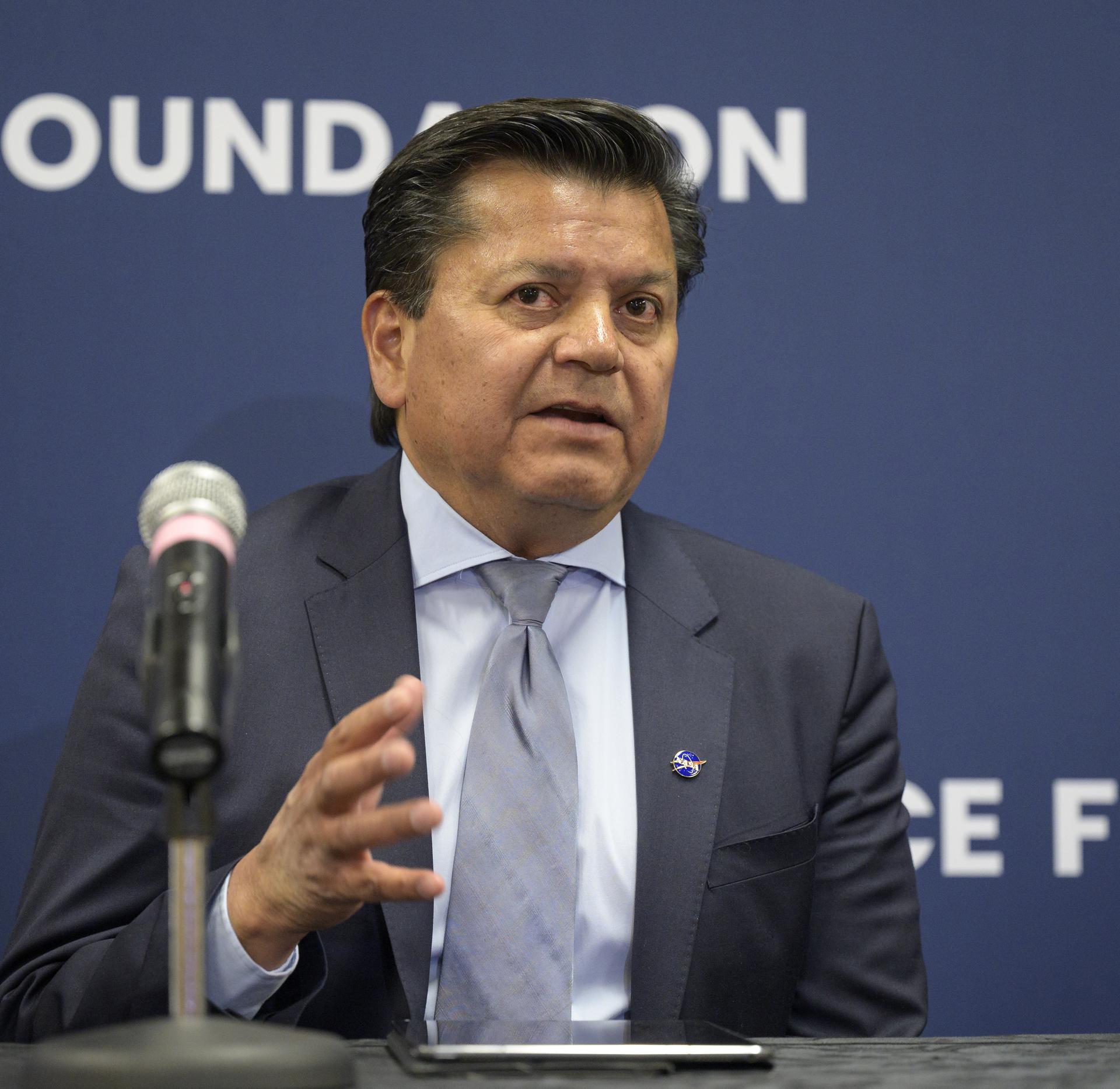 Andres Martinez, program executive for small spacecraft in NASA’s Exploration Systems Development Mission Directorate speaks at “Small Satellites, Big Missions: Pathfinding CubeSats Exploring the Moon and Beyond,” a news conference during the 37th Space Symposium, Wednesday, April 6, 2022, in Colorado Springs, Colorado. Photo Credit: (NASA/Bill Ingalls)