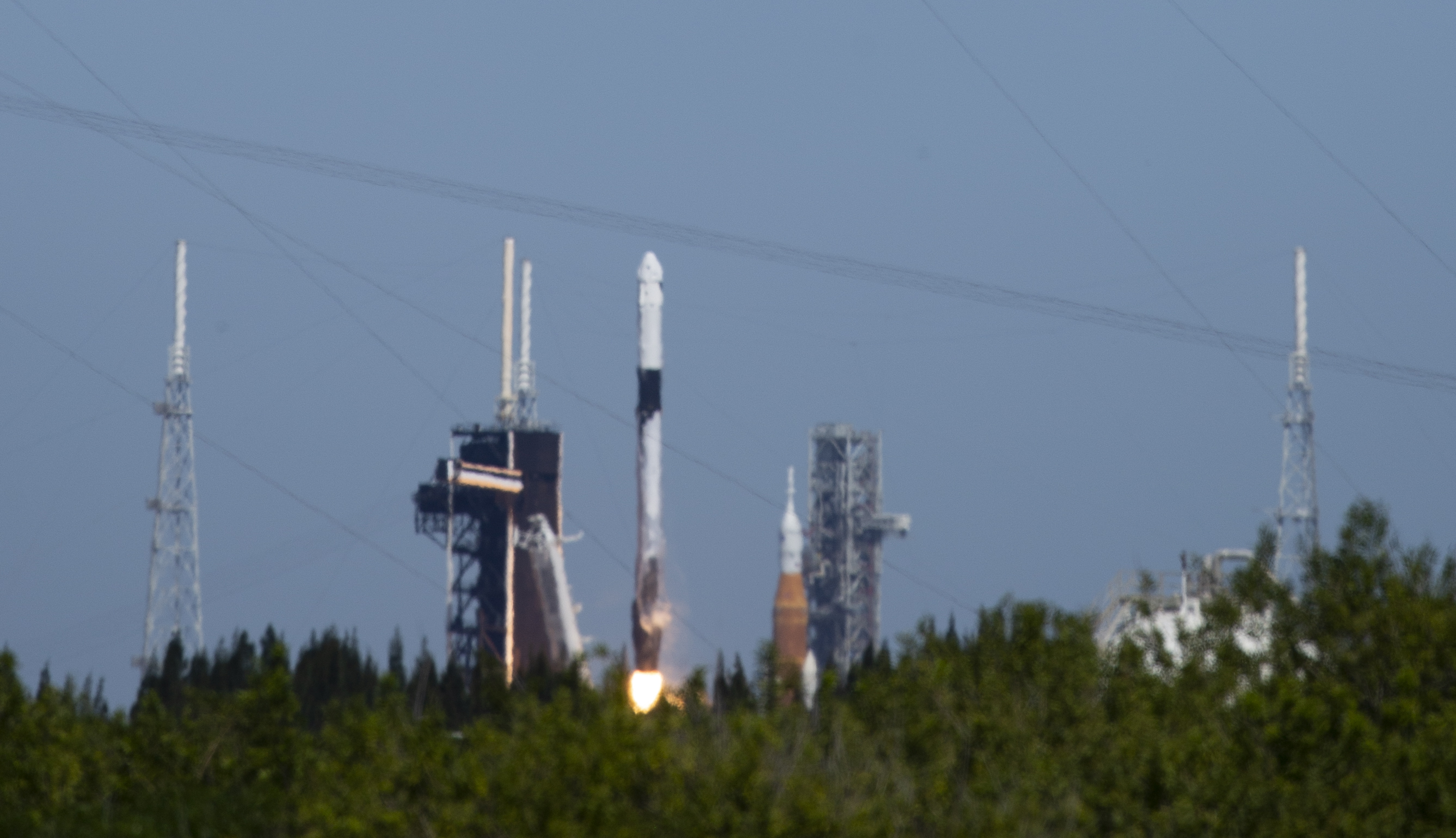 NASA’s Space Launch System (SLS) rocket with the Orion spacecraft aboard is seen atop a mobile launcher at Launch Complex 39B, right, as a SpaceX Falcon 9 rocket carrying the company's Crew Dragon spacecraft is launched on Axiom Mission 1 (Ax-1) to the International Space Station with Commander Michael López-Alegría of Spain and the United States, Pilot Larry Connor of the United States, and Mission Specialists Eytan Stibbe of Israel, and Mark Pathy of Canada aboard, Friday, April 8, 2022, at NASA’s Kennedy Space Center in Florida. The Ax-1 mission is the first private astronaut mission to the International Space Station. López-Alegría, Connor, Pathy, Stibbe launched at 11:17 a.m. from Launch Complex 39A at the Kennedy Space Center to begin their 10-day mission. Photo Credit: (NASA/Joel Kowsky)