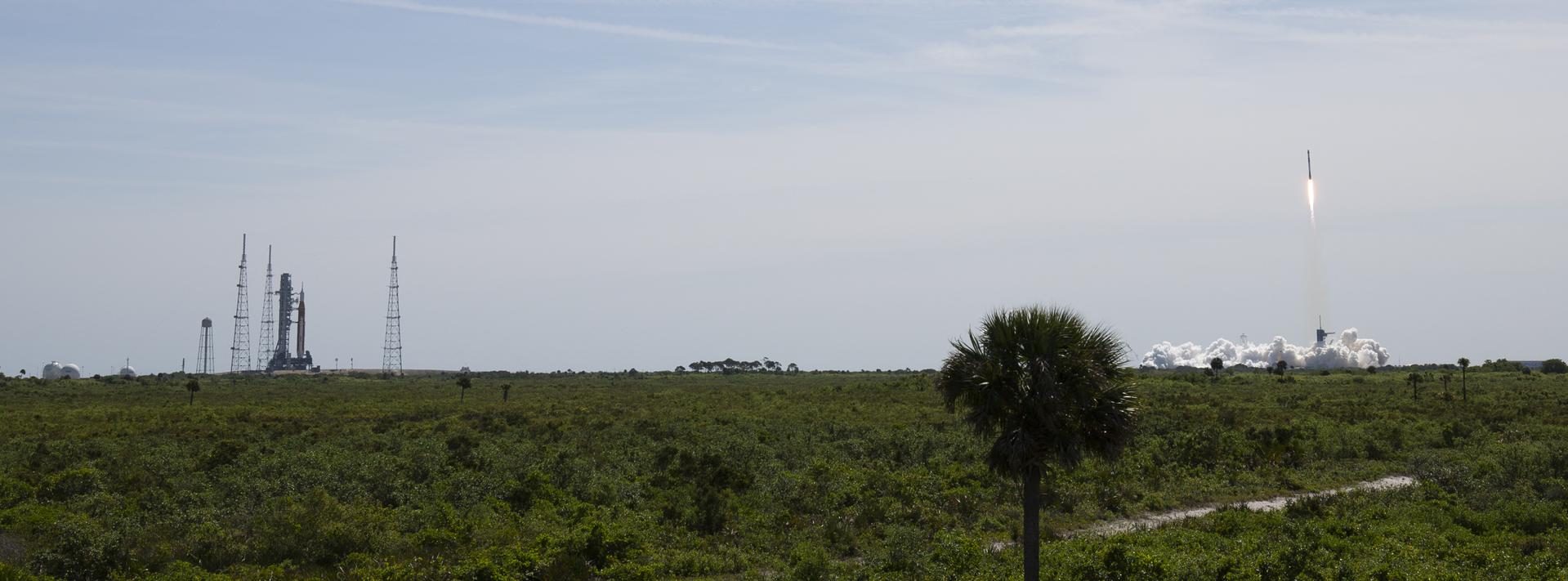 NASA’s Space Launch System (SLS) rocket with the Orion spacecraft aboard is seen atop a mobile launcher at Launch Complex 39B, left, as a SpaceX Falcon 9 rocket carrying the company's Crew Dragon spacecraft is launched on Axiom Mission 1 (Ax-1) to the International Space Station with Commander Michael López-Alegría of Spain and the United States, Pilot Larry Connor of the United States, and Mission Specialists Eytan Stibbe of Israel, and Mark Pathy of Canada aboard, Friday, April 8, 2022, at NASA’s Kennedy Space Center in Florida. The Ax-1 mission is the first private astronaut mission to the International Space Station. López-Alegría, Connor, Pathy, Stibbe launched at 11:17 a.m. from Launch Complex 39A at the Kennedy Space Center to begin their 10-day mission. Photo Credit: (NASA/Joel Kowsky)