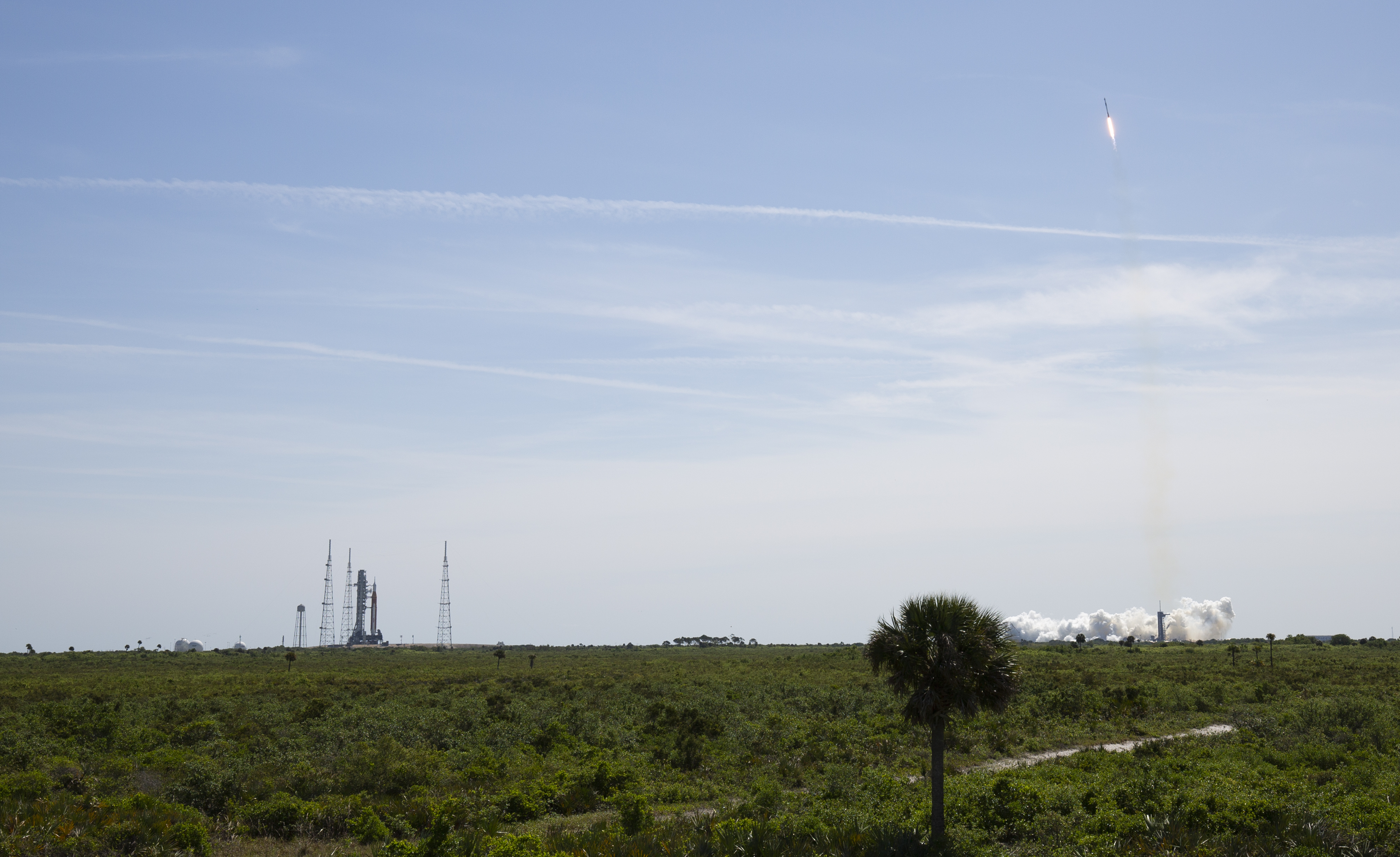 NASA’s Space Launch System (SLS) rocket with the Orion spacecraft aboard is seen atop a mobile launcher at Launch Complex 39B, left, as a SpaceX Falcon 9 rocket carrying the company's Crew Dragon spacecraft is launched on Axiom Mission 1 (Ax-1) to the International Space Station with Commander Michael López-Alegría of Spain and the United States, Pilot Larry Connor of the United States, and Mission Specialists Eytan Stibbe of Israel, and Mark Pathy of Canada aboard, Friday, April 8, 2022, at NASA’s Kennedy Space Center in Florida. The Ax-1 mission is the first private astronaut mission to the International Space Station. López-Alegría, Connor, Pathy, Stibbe launched at 11:17 a.m. from Launch Complex 39A at the Kennedy Space Center to begin their 10-day mission. Photo Credit: (NASA/Joel Kowsky)