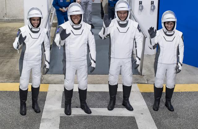 From left to right, NASA astronauts Jessica Watkins, Robert Hines, and Kjell Lindgren, and ESA (European Space Agency) astronaut Samantha Cristoforetti, wearing SpaceX spacesuits, are seen as they prepare to depart the Neil A. Armstrong Operations and Checkout Building for Launch Complex 39A during a dress rehearsal prior to the Crew-4 mission launch, Wednesday, April 20, 2022, at NASA’s Kennedy Space Center in Florida. NASA’s SpaceX Crew-4 mission is the fourth crew rotation mission of the SpaceX Crew Dragon spacecraft and Falcon 9 rocket to the International Space Station as part of the agency’s Commercial Crew Program. Lindgren, Hines, Watkins, and Cristoforetti are scheduled to launch on April 23 at 5:26 a.m. EDT, from Launch Complex 39A at the Kennedy Space Center. Photo Credit: (NASA/Aubrey Gemignani)