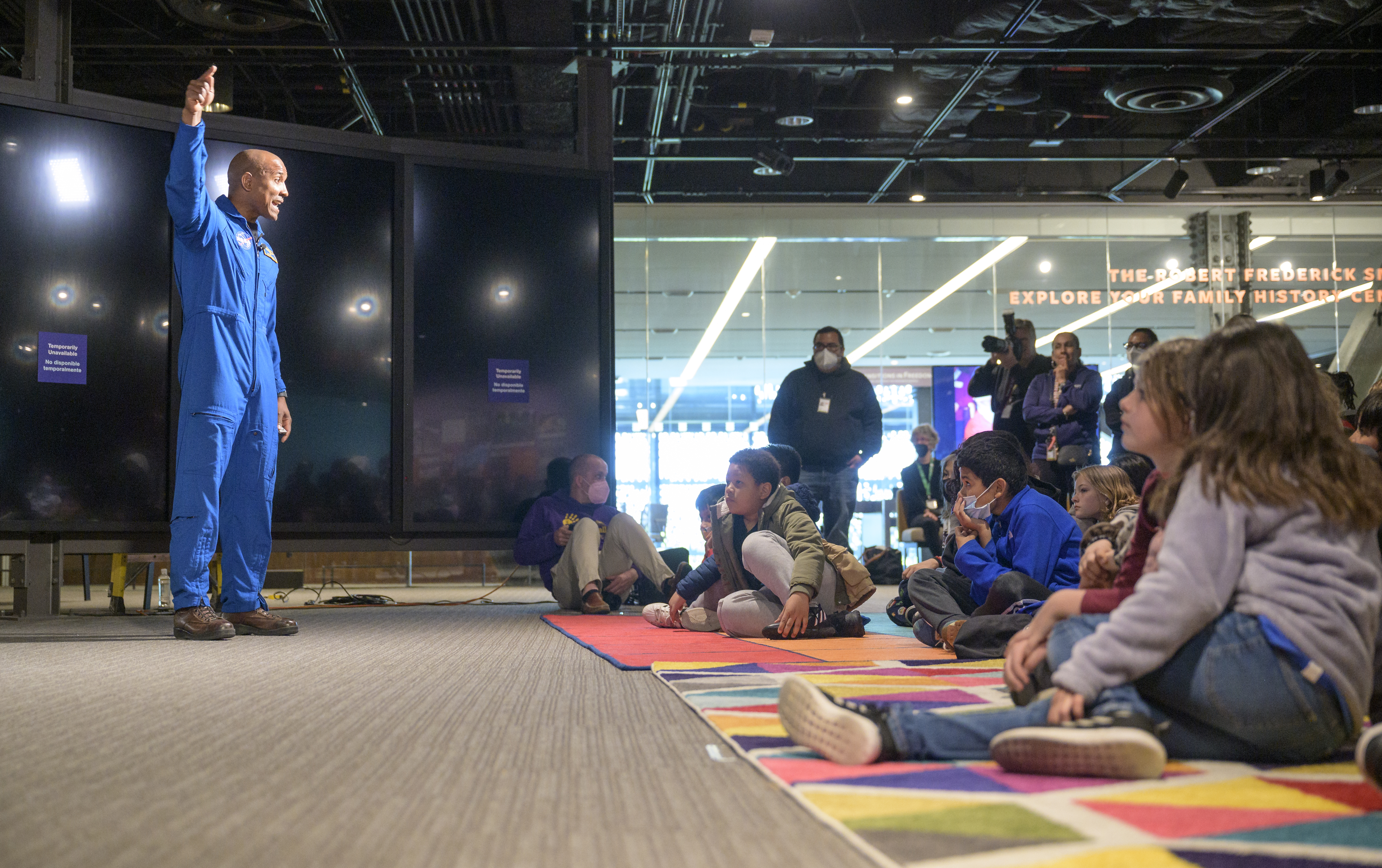 NASA astronaut Victor Glover talks with school students in person and via live stream during an educational event, Thursday, April 28, 2022, at the National Museum of African American History and Culture in Washington. Glover most recently served as pilot and second-in-command on the Crew-1 SpaceX Crew Dragon, named Resilience, which landed after a long duration mission aboard the International Space Station, May 2, 2021. Photo Credit: (NASA/Bill Ingalls)