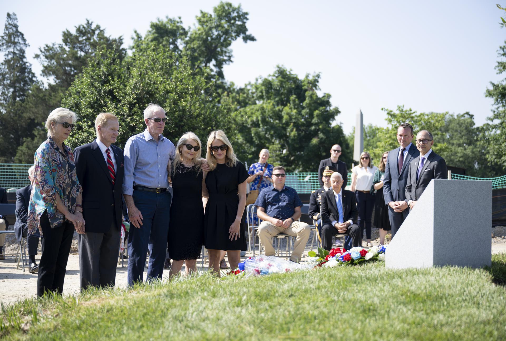 Family members of Apollo 1 astronaut Edward H. White II are joined by NASA Administrator Bill Nelson as they place flowers at the Apollo 1 monument during its dedication at Arlington National Cemetery, Thursday, June 2, 2022, in Arlington, Va. The monument honors and memorializes the Apollo 1 crew of Virgil I. “Gus” Grissom, Edward H. White II, and Roger B. Chaffee. Photo Credit: (NASA/Bill Ingalls)