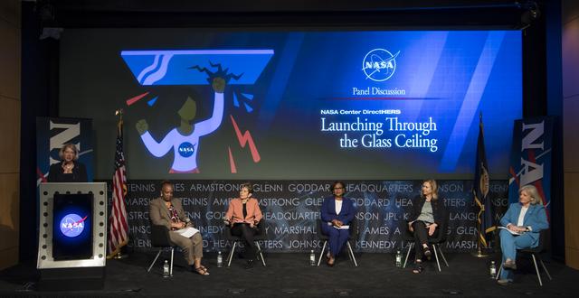 NASA Deputy Administrator Pam Melroy provides opening remarks for a panel discussion with NASA's four female center directors: Dr. Marla Peréz-Davis of Glenn Research Center, third from left, Vanessa Wyche of Johnson Space Center, center, Janet Petro of Kennedy Space Center, second from right, and Jody Singer of Marshall Space Flight Center, right, moderated by NASA General Counsel Sumara Thompson-King, second from left, during the "DirectHERS" - Launching Through the Glass Ceiling event, Tuesday, June 7, 2022, at the Mary W. Jackson NASA Headquarters Building in Washington. Photo Credit: (NASA/Aubrey Gemignani)