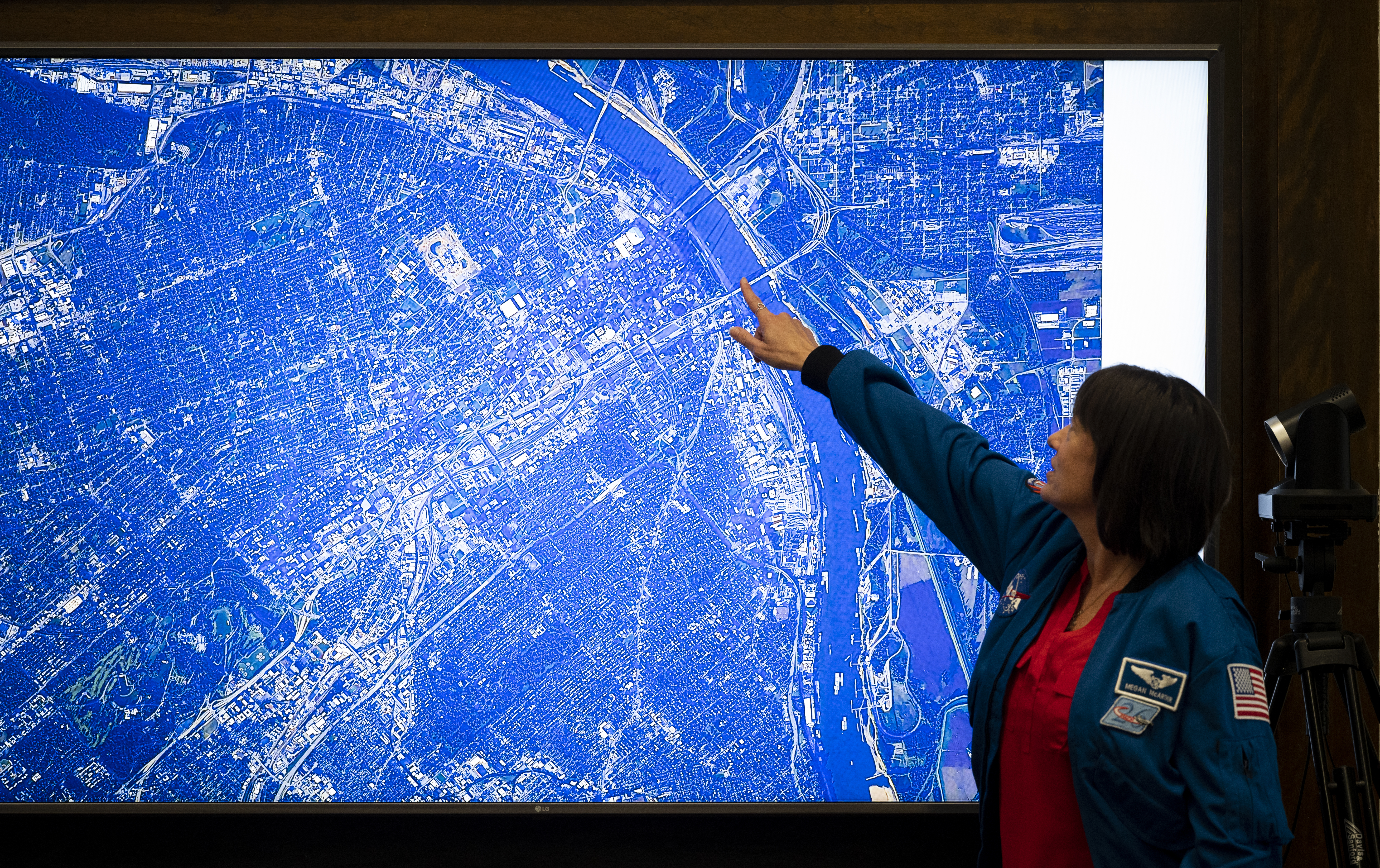 NASA astronaut Megan McArthur points to the shadow of the Gateway Arch on the Mississippi River in St. Louis while showing images of National Parks taken from the International Space Station during Expeditions 65 and 66 during a presentation to leadership and rangers who participate in the National Park Service’s astronomy and dark sky programs, Thursday, June 9, 2022 at the U.S. Department of the Interior in Washington, DC. McArthur, NASA astronaut Shane Kimbrough, Japan Aerospace Exploration Agency (JAXA) astronaut Akihiko Hoshide, and ESA (European Space Agency) astronaut Thomas Pesquet, flew on NASA’s SpaceX Crew-2 mission, the second crew rotation mission to the International Space Station as part of the agency’s Commercial Crew Program, and spent 198 days aboard the orbiting laboratory as part of Expeditions 65 and 66. Photo Credit: (NASA/Joel Kowsky)