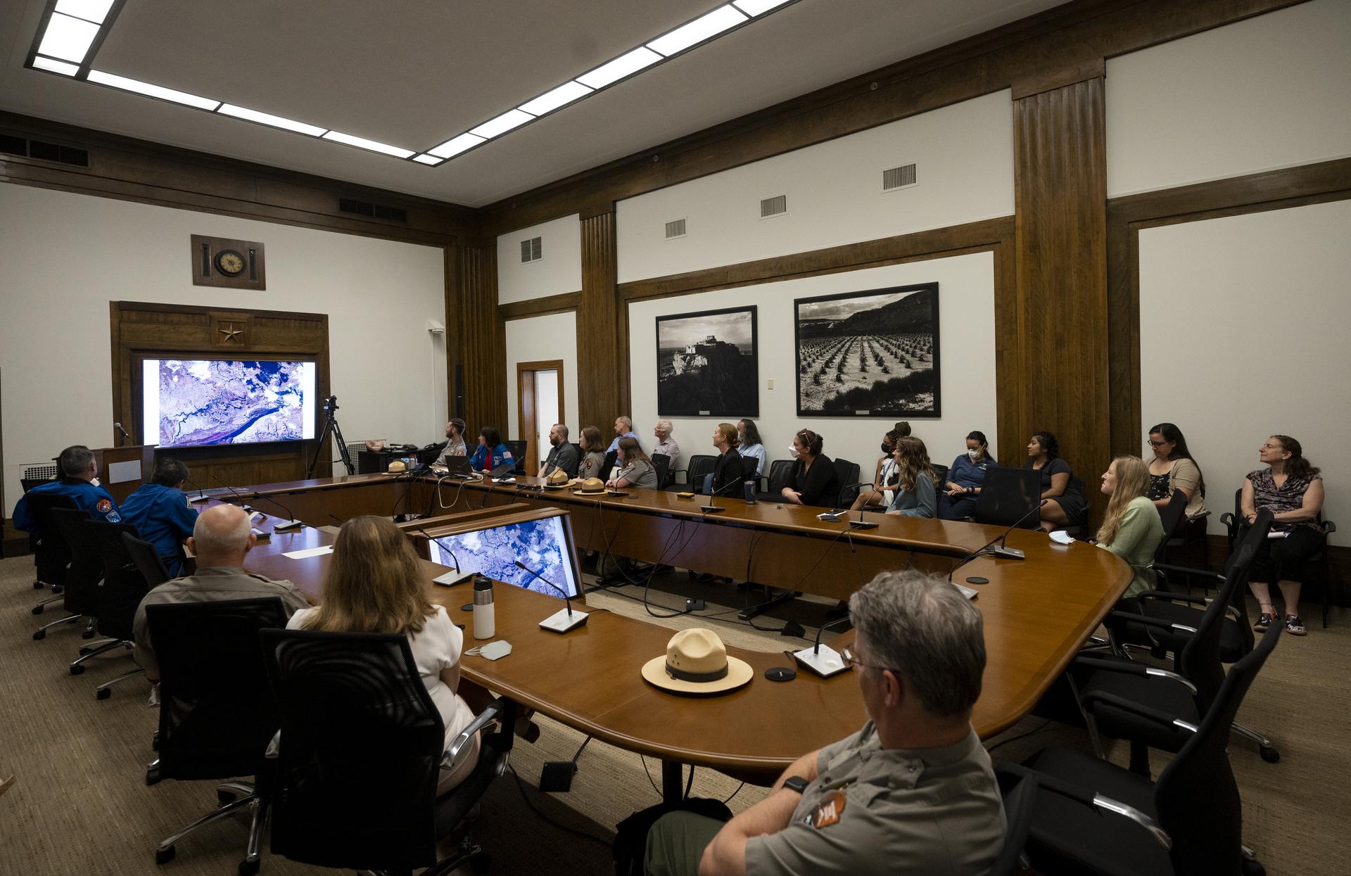 NASA astronaut Megan McArthur shows pictures of National Parks taken from the International Space Station during Expeditions 65 and 66 during a presentation to leadership and rangers who participate in the National Park Service’s astronomy and dark sky programs, Thursday, June 9, 2022 at the U.S. Department of the Interior in Washington, DC. McArthur, NASA astronaut Shane Kimbrough, Japan Aerospace Exploration Agency (JAXA) astronaut Akihiko Hoshide, and ESA (European Space Agency) astronaut Thomas Pesquet, flew on NASA’s SpaceX Crew-2 mission, the second crew rotation mission to the International Space Station as part of the agency’s Commercial Crew Program, and spent 198 days aboard the orbiting laboratory as part of Expeditions 65 and 66. Photo Credit: (NASA/Joel Kowsky)