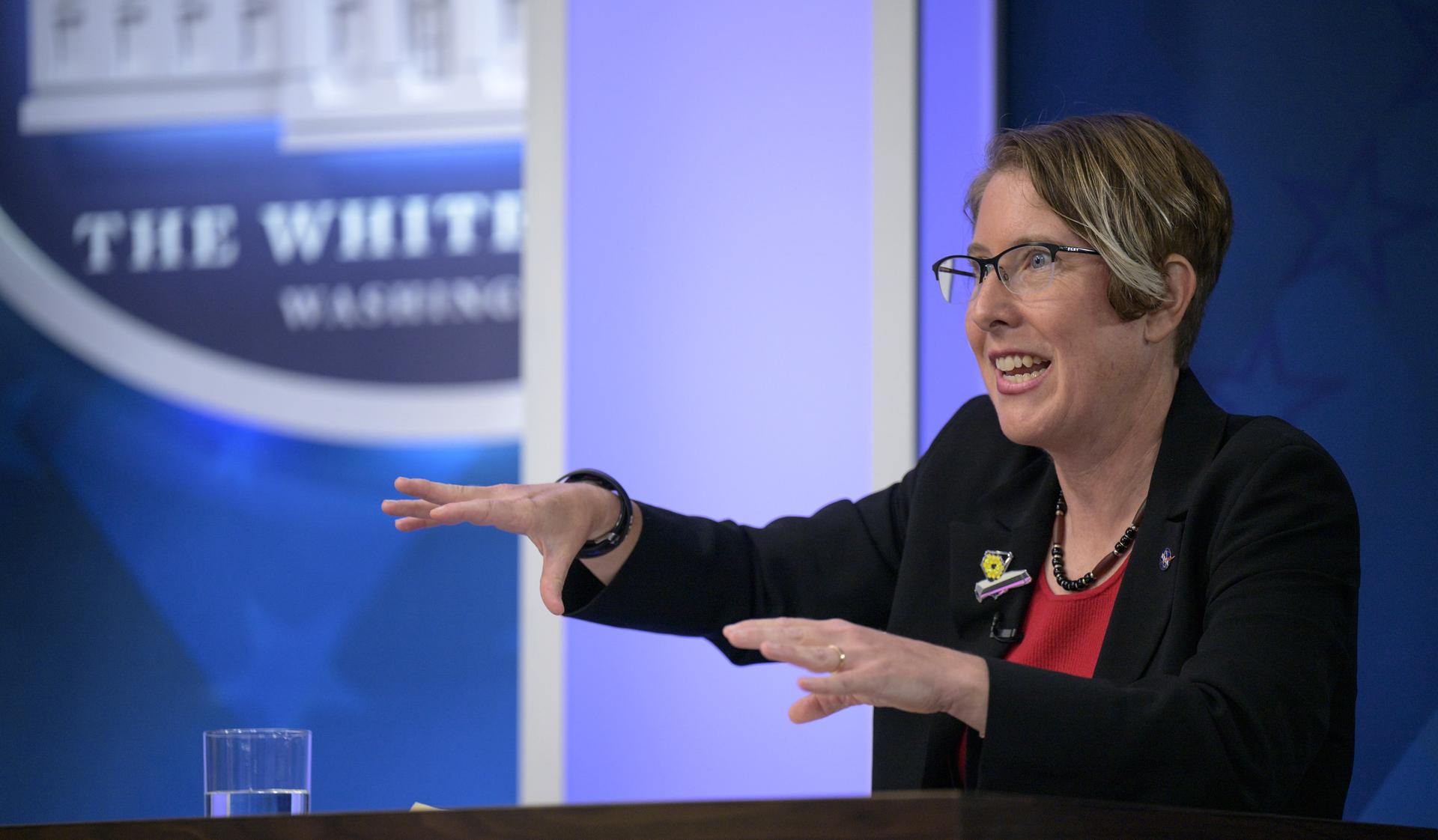 NASA James Webb Space Telescope Operations Project Scientist Jane Rigby talks with U.S. President Joe Biden in a meeting where they previewed images from NASA’s James Webb Space Telescope, Monday, July 11, 2022, in the South Court Auditorium in the Eisenhower Executive Office Building on the White House complex in Washington. Photo Credit: (NASA/Bill Ingalls)