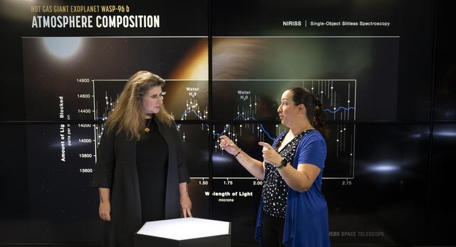 NASA James Webb Space Telescope Deputy Project Scientist for Exoplanet Science Knicole Colón speaks about the measurements of exoplanet WASP-96 b taken by the Near-Infrared Imager and Slitless Spectrograph as it is shown on screen during a broadcast releasing the telescope’s first full-color images, Tuesday, July 12, 2022, at NASA’s Goddard Space Flight Center in Greenbelt, Md. The first full-color images and spectroscopic data from the James Webb Space Telescope, a partnership with ESA (European Space Agency) and the Canadian Space Agency (CSA), are a demonstration of the power of Webb as the telescope begins its science mission to unfold the infrared universe. Photo Credit: (NASA/Bill Ingalls)