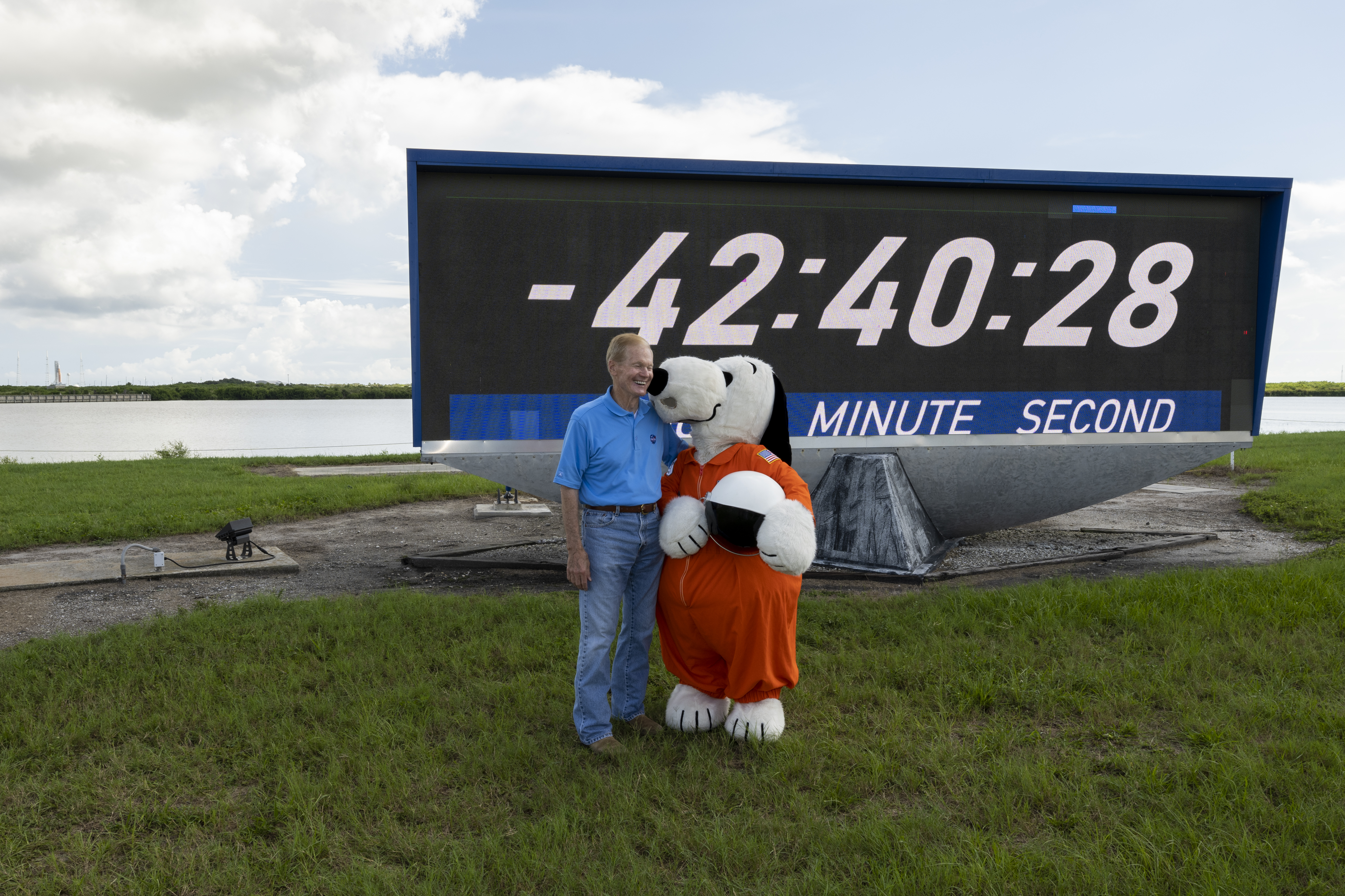 NASA Administrator Bill Nelson poses for a picture with Snoopy at the Press Site countdown clock, Saturday, Aug. 27, 2022, at NASA’s Kennedy Space Center in Florida. NASA’s Artemis I flight test is the first integrated flight test of the agency’s deep space exploration systems: the Orion spacecraft, Space Launch System (SLS) rocket, and ground systems. Launch of the uncrewed flight test is targeted for no earlier than Aug. 29 at 8:33 a.m. ET. Photo Credit: (NASA/Keegan Barber)