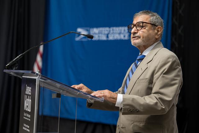 United States Postal Service Vice Chairman, Board of Governors, Anton Hajjar, provides remarks at the first-day-of-issue event for the United States Postal Service’s new stamp celebrating NASA’s James Webb Space Telescope (JWST) on Thursday, Sept. 8, 2022, at the Smithsonian’s National Postal Museum in Washington. The stamp, which features an illustration of the observatory, honors Webb’s mission to explore the unknown in our universe – solving mysteries in our solar system, looking beyond to distant worlds around other stars, and probing the structures and origins of our universe and our place in it. Photo Credit: (NASA/Aubrey Gemignani)