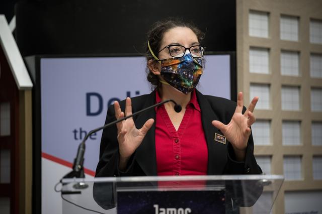 NASA’s Goddard Space Flight Center Webb Deputy Observatory Project Scientist, Erin Smith, provides remarks at the first-day-of-issue event for the United States Postal Service’s new stamp celebrating NASA’s James Webb Space Telescope (JWST) on Thursday, Sept. 8, 2022, at the Smithsonian’s National Postal Museum in Washington. The stamp, which features an illustration of the observatory, honors Webb’s mission to explore the unknown in our universe – solving mysteries in our solar system, looking beyond to distant worlds around other stars, and probing the structures and origins of our universe and our place in it. Photo Credit: (NASA/Aubrey Gemignani)
