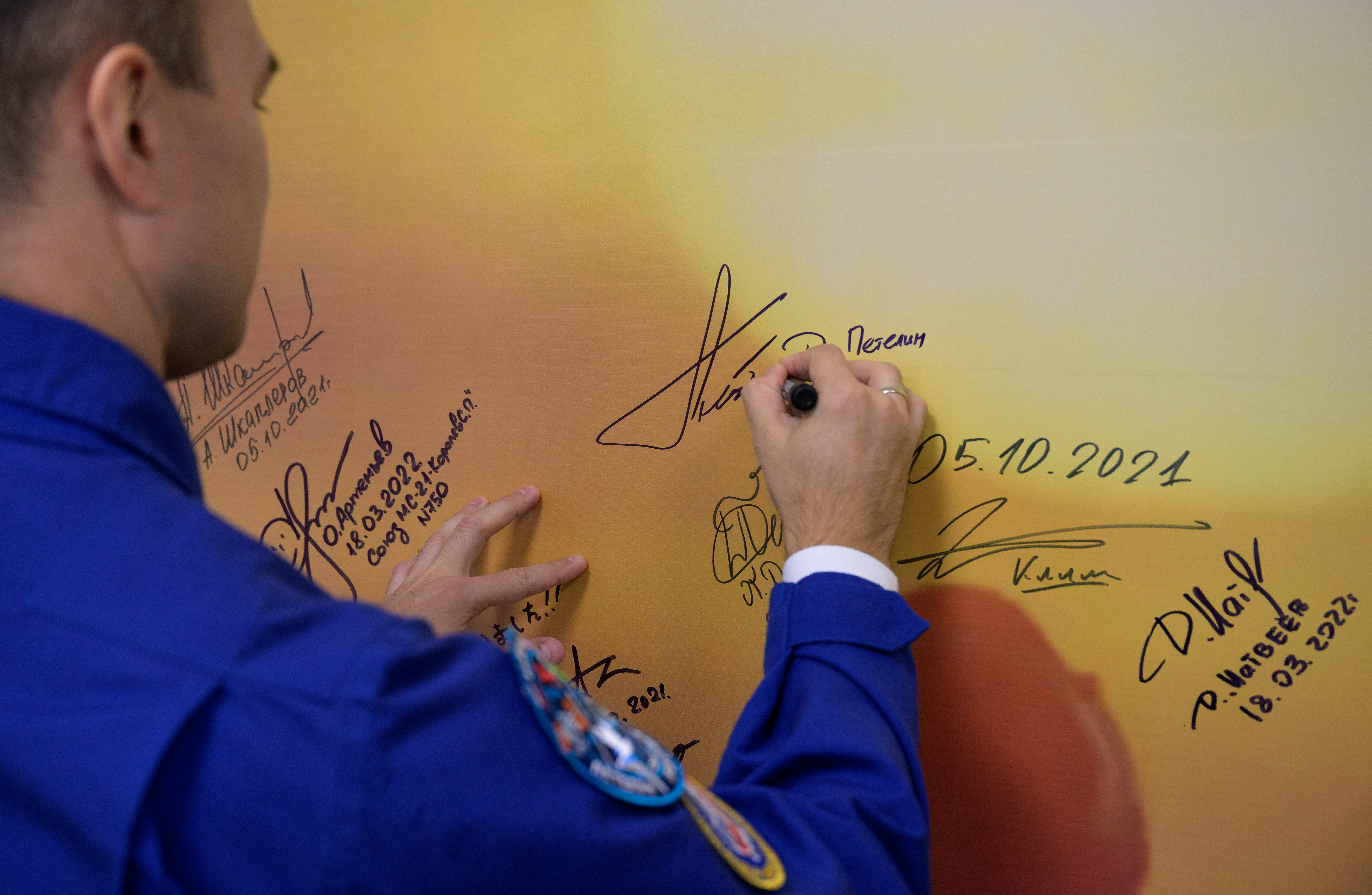 Expedition 68 cosmonaut Dmitri Petelinof Roscosmos signs a photo inside the Cosmonaut Hotel prior to departing for building 254 in order to suitup for launch on a Soyuz rocket with fellow crewmates Sergey Prokopyev of Roscosmos and Frank Rubio of NASA, Wednesday, Sept. 21, 2022, in Baikonur, Kazakhstan. Rubio, Prokopyev and Petelin launched on their Soyuz MS-22 spacecraft later in the day from the Baikonur Cosmodrome for a mission on the International Space Station. Photo Credit: (NASA/Bill Ingalls)