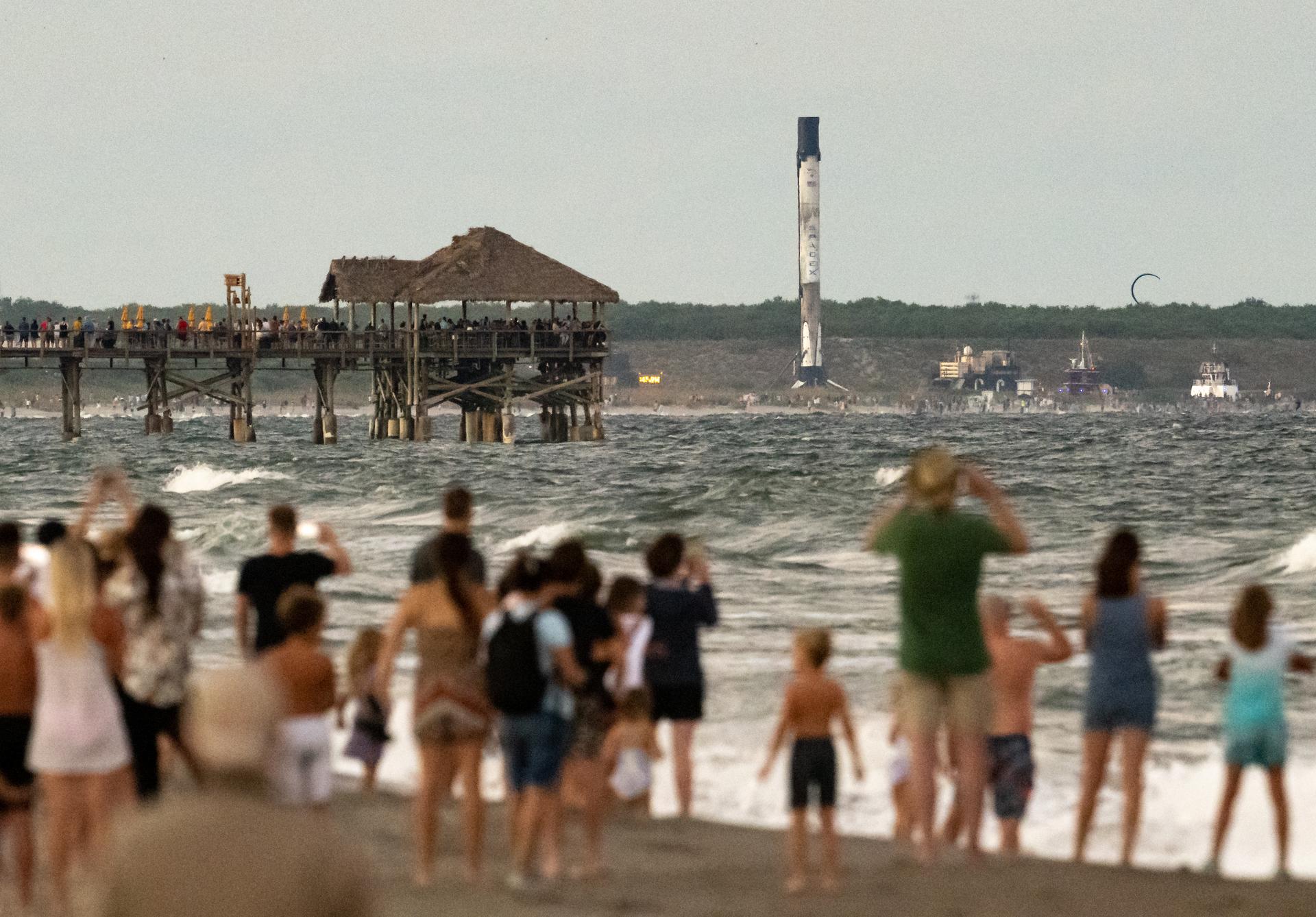 Beach goers watch as the Falcon 9 rocket booster used for NASA’s SpaceX Crew-5 launch, sitting atop the autonomous spaceport drone ship (ASDS), is towed into Port Canaveral, Saturday, Oct. 8, 2022, in Cape Canaveral, Florida. NASA’s SpaceX Crew-5 mission is the fifth crew rotation mission of the SpaceX Crew Dragon spacecraft and Falcon 9 rocket to the International Space Station as part of the agency’s Commercial Crew Program. NASA astronauts Nicole Mann and Josh Cassada, Japan Aerospace Exploration Agency (JAXA) astronaut Koichi Wakata, and Roscosmos cosmonaut Anna Kikina launched on Oct. 5 from Launch Complex 39A at the Kennedy Space Center. Photo Credit: (NASA/Bill Ingalls)