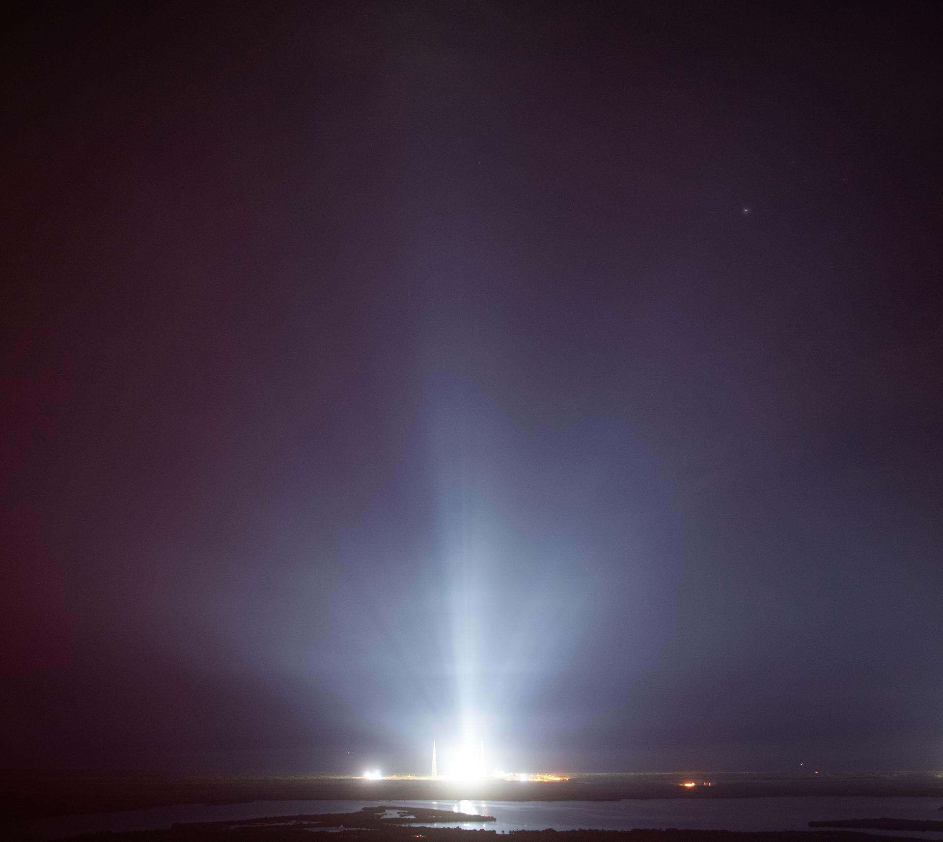 NASA’s Space Launch System (SLS) rocket with the Orion spacecraft aboard is seen atop the mobile launcher at Launch Pad 39B illuminated by spotlights, Tuesday, Nov. 15, 2022, as the Artemis I launch teams load more than 700,000 gallons of cryogenic propellants including liquid hydrogen and liquid oxygen as the launch countdown progresses at NASA’s Kennedy Space Center in Florida. NASA’s Artemis I flight test is the first integrated test of the agency’s deep space exploration systems: the Orion spacecraft, SLS rocket, and supporting ground systems. Launch of the uncrewed flight test is targeted for no earlier Nov. 16 at 1:04 a.m. EST. Photo Credit: (NASA/Joel Kowsky)
