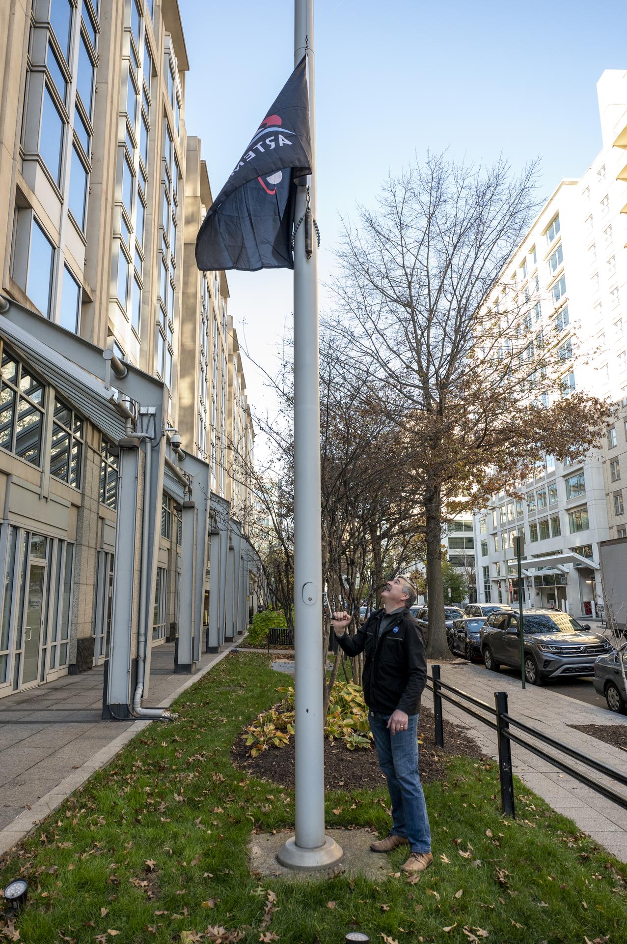 Artemis Mission Development Manager Mike Sarafin, Artemis Mission Integration Manager Sheela Logan, and Assistant Deputy Associate Administrator for Exploration Systems Development Tom Whitmeyer raise Artemis flags Wednesday, Nov. 23, 2022, at the Mary W. Jackson NASA Headquarters building in Washington. Photo Credit: (NASA/Keegan Barber)