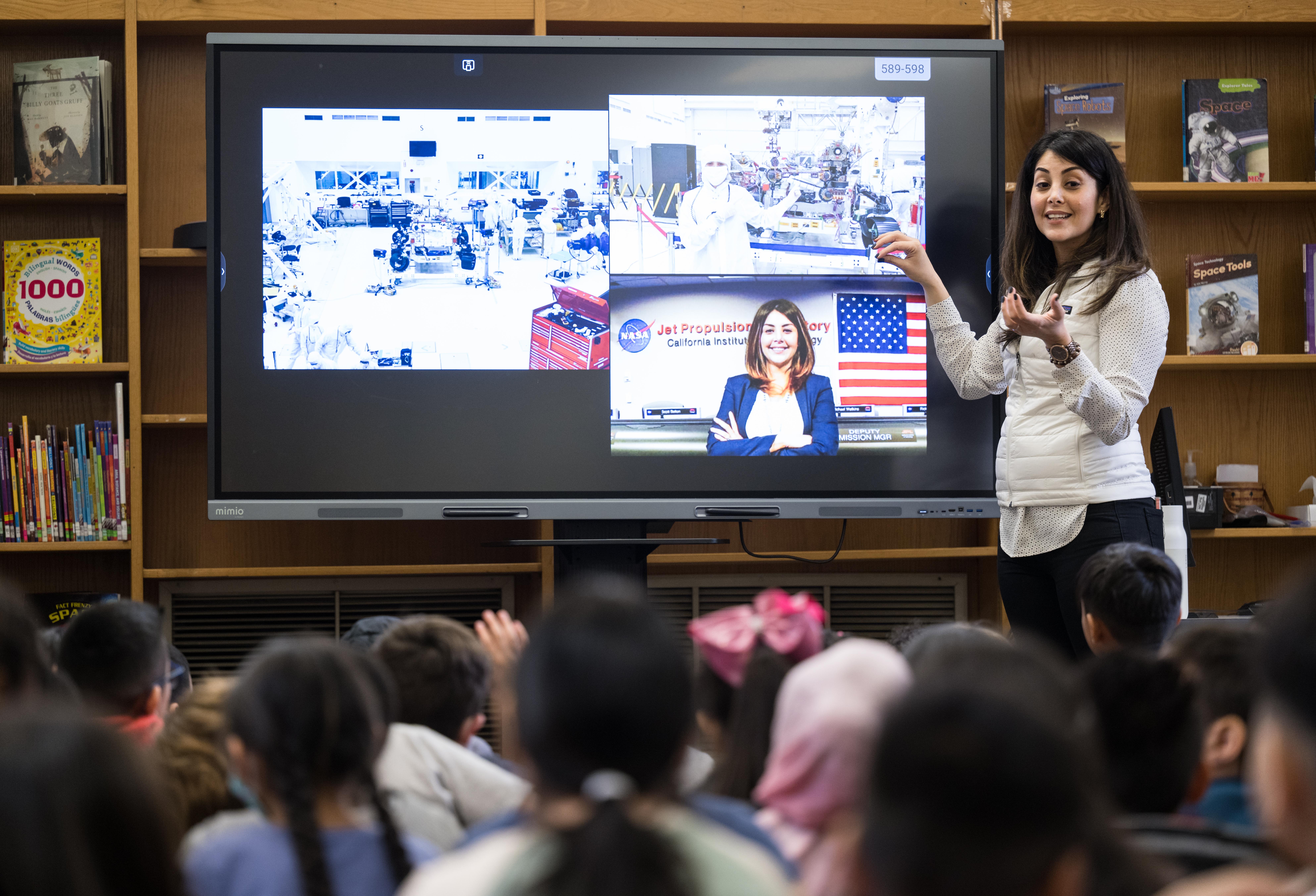NASA Technical Group Supervisor for Sequence Planning and Execution and Tactical Mission Lead for the Mars Perseverance rover, Diana Trujillo, speaks to students at Rolling Terrace Elementary School, Monday, March 13, 2023, in Takoma Park, Maryland. Photo Credit: (NASA/Aubrey Gemignani)