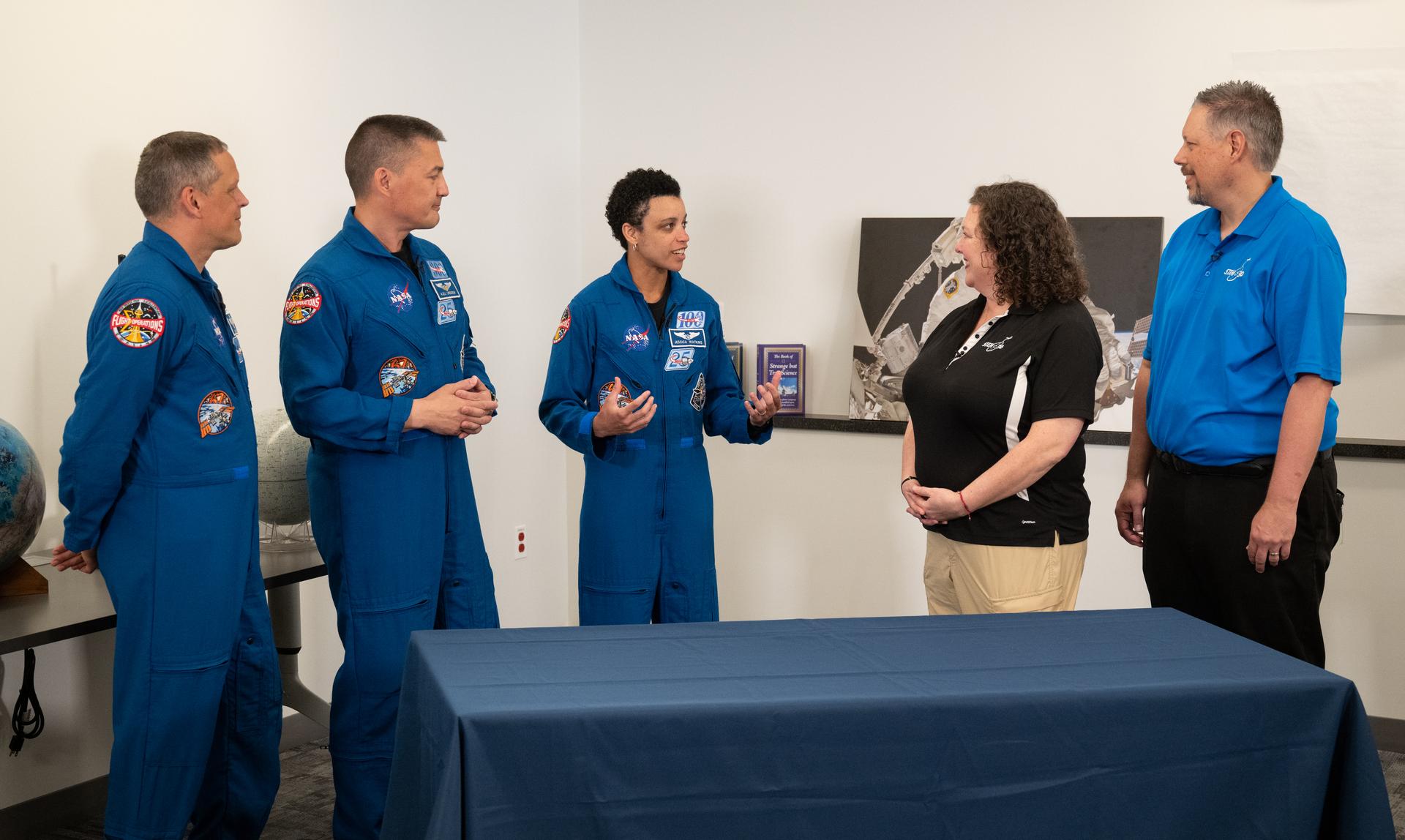 NASA astronauts Robert Hines, left, Kjell Lindgren, second from left, and Jessica Watkins, center, speak with Beth Wilson, second from right and Marty Kelsey, right, while taping a segment for STEM in 30, Tuesday, March 28, 2023 at the Smithsonian’s National Air and Space Museum in Washington. Lindgren, Hines, and Watkins spent 170 days in space as part of Expeditions 67 and 68 aboard the International Space Station. Photo Credit: (NASA/Joel Kowsky)