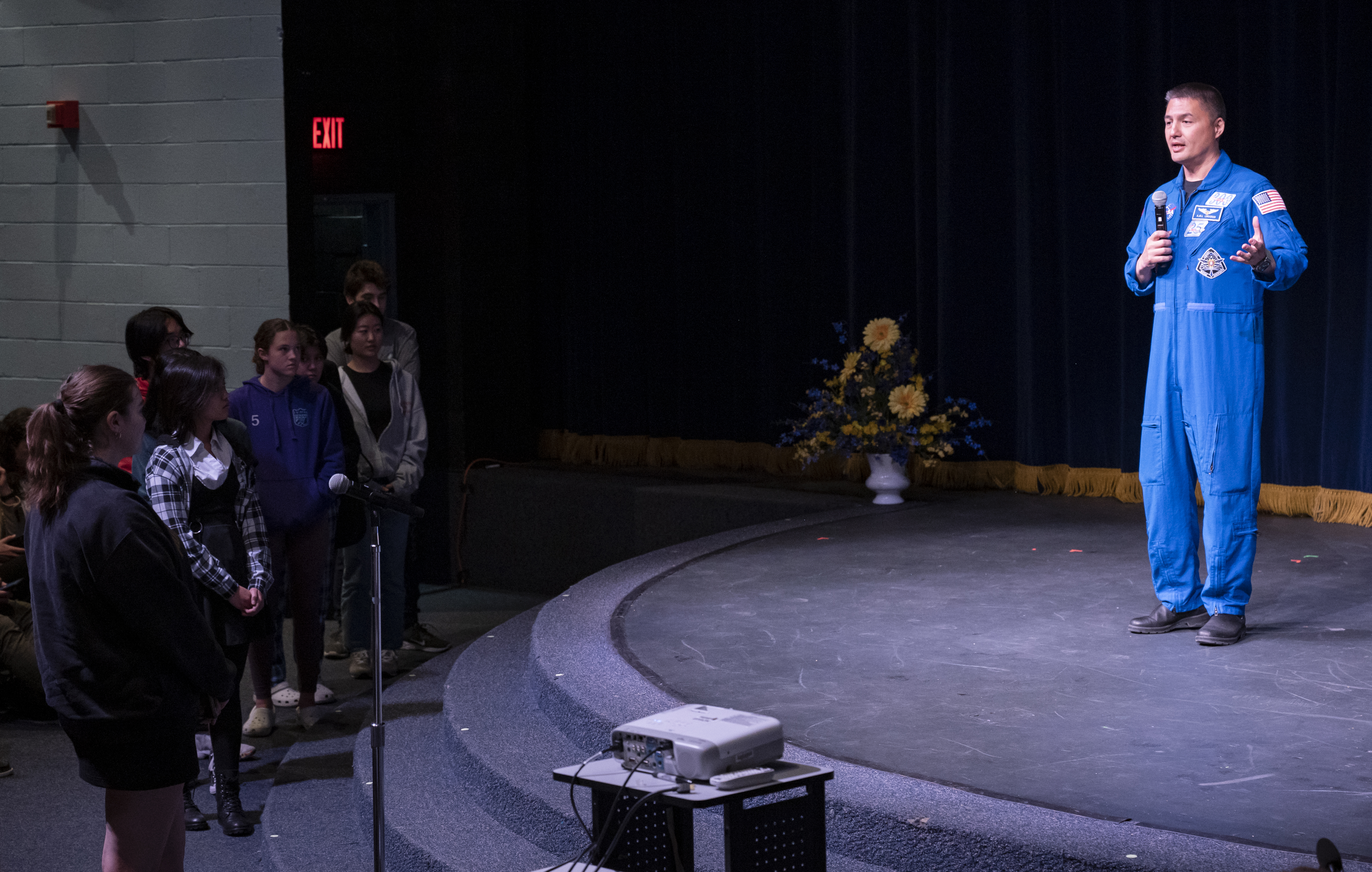 NASA Astronaut Kjell Lindgren answers questions from students during a STEM event with NASA Administrator Bill Nelson and Senator Tim Kaine (D-Va.) at James W. Robinson Secondary School, Friday, March 31, 2023, in Fairfax, Virginia. Lindgren spent 170 days in space as part of Expeditions 67 and 68 aboard the International Space Station. Photo Credit: (NASA/Keegan Barber)