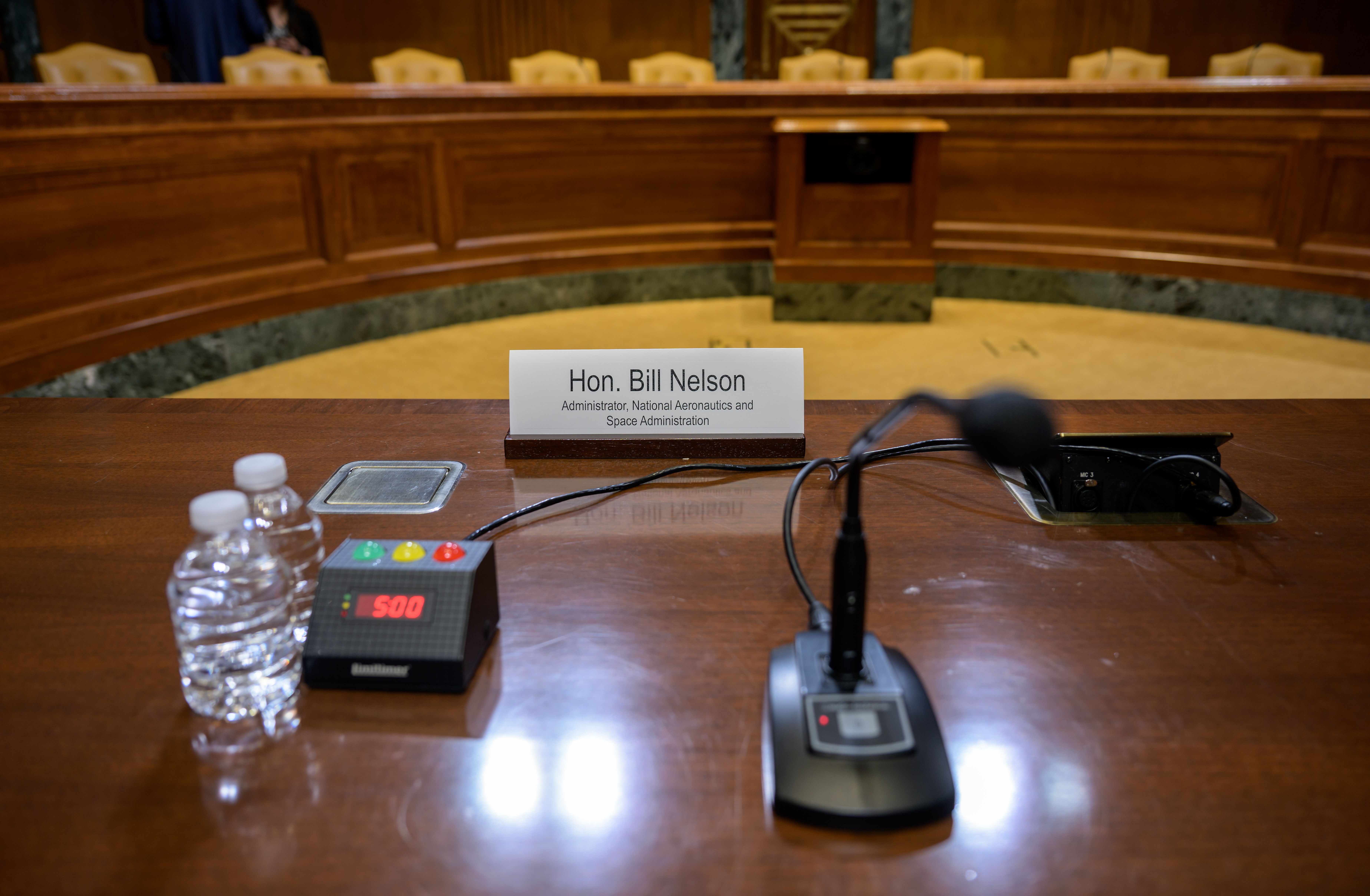 The witness table is seen ahead of NASA Administrator Bill Nelson testifing before the Senate Appropriations’ Commerce, Justice, Science, and Related Agencies subcommittee during a budget hearing, Tuesday, April 18, 2023, at the Dirksen Senate Office Building in Washington. Photo Credit: (NASA/Bill Ingalls)