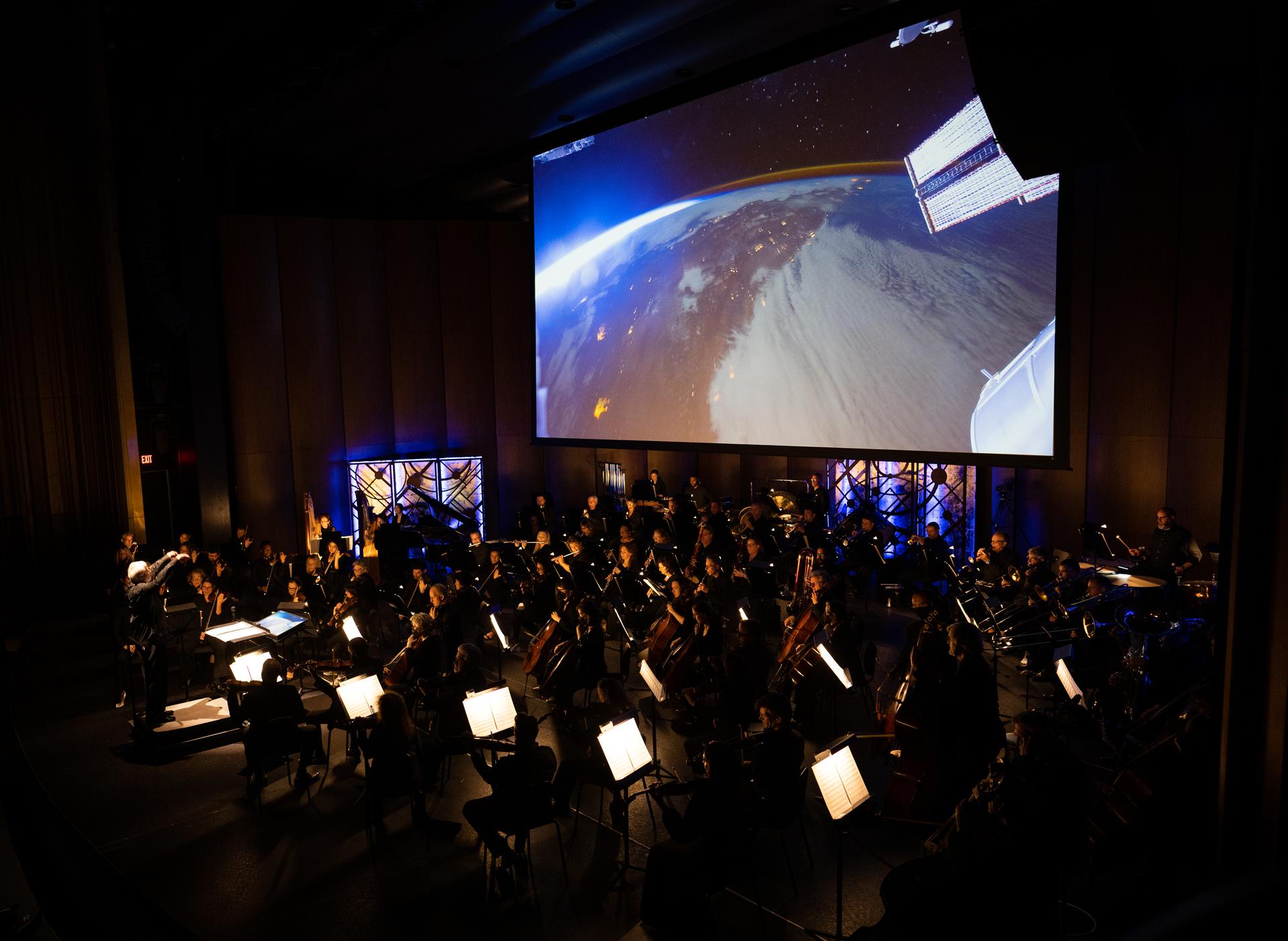 Maestro Piotr Gajewski conducts the National Philharmonic in the world premier performance of Henry Dehlinger’s “Cosmic Cycles,” Thursday, May 11, 2023, at Capital One Hall in Tysons, Va. “Cosmic Cycles: A Space Symphony” is a collaboration between composer Henry Dehlinger, NASA’s Goddard Space Flight Center, and the National Philharmonic that features a fusion of music and video in seven multimedia works on the Sun, Earth, Moon, Planets, and Cosmos. Photo Credit: (NASA/Joel Kowsky)