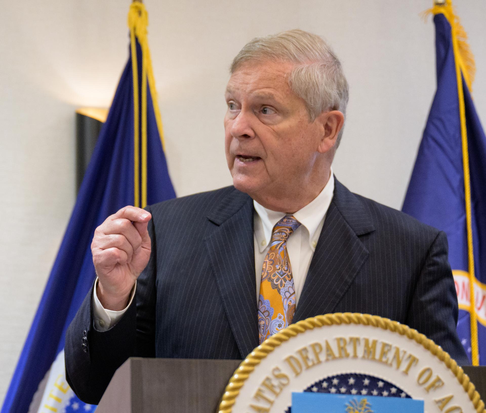 U.S. Secretary of Agriculture Thomas Vilsack gives remarks prior to signing a memorandum of understanding between NASA and USDA, Wednesday, June 21, 2023, at the USDA’s Jamie L. Whitten Building in Washington. The agreement strengthens the collaboration between the two agencies, including efforts to improve agricultural and Earth science research, technology, and agricultural management, as well as the application of science data and models to agricultural decision making. Photo Credit: (NASA/Bill Ingalls)