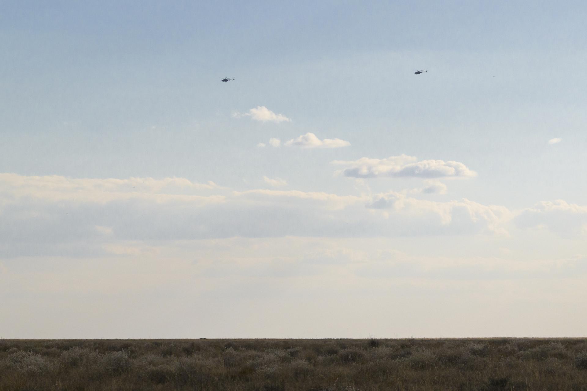 Russian Search and Recovery Force helicopters fly around the predicted landing zone for the Soyuz MS-23 capsule with Expedition 69 NASA astronaut Frank Rubio, Roscosmos cosmonauts Dmitri Petelin and Sergey Prokopyev, Wednesday, Sept. 27, 2023, outside of Zhezkazgan, Kazakhstan. The trio are returning to Earth after logging 371 days in space as members of Expeditions 68-69 aboard the International Space Station. For Rubio, his mission is the longest single spaceflight by a U.S. astronaut in history. Photo Credit: (NASA/Bill Ingalls)