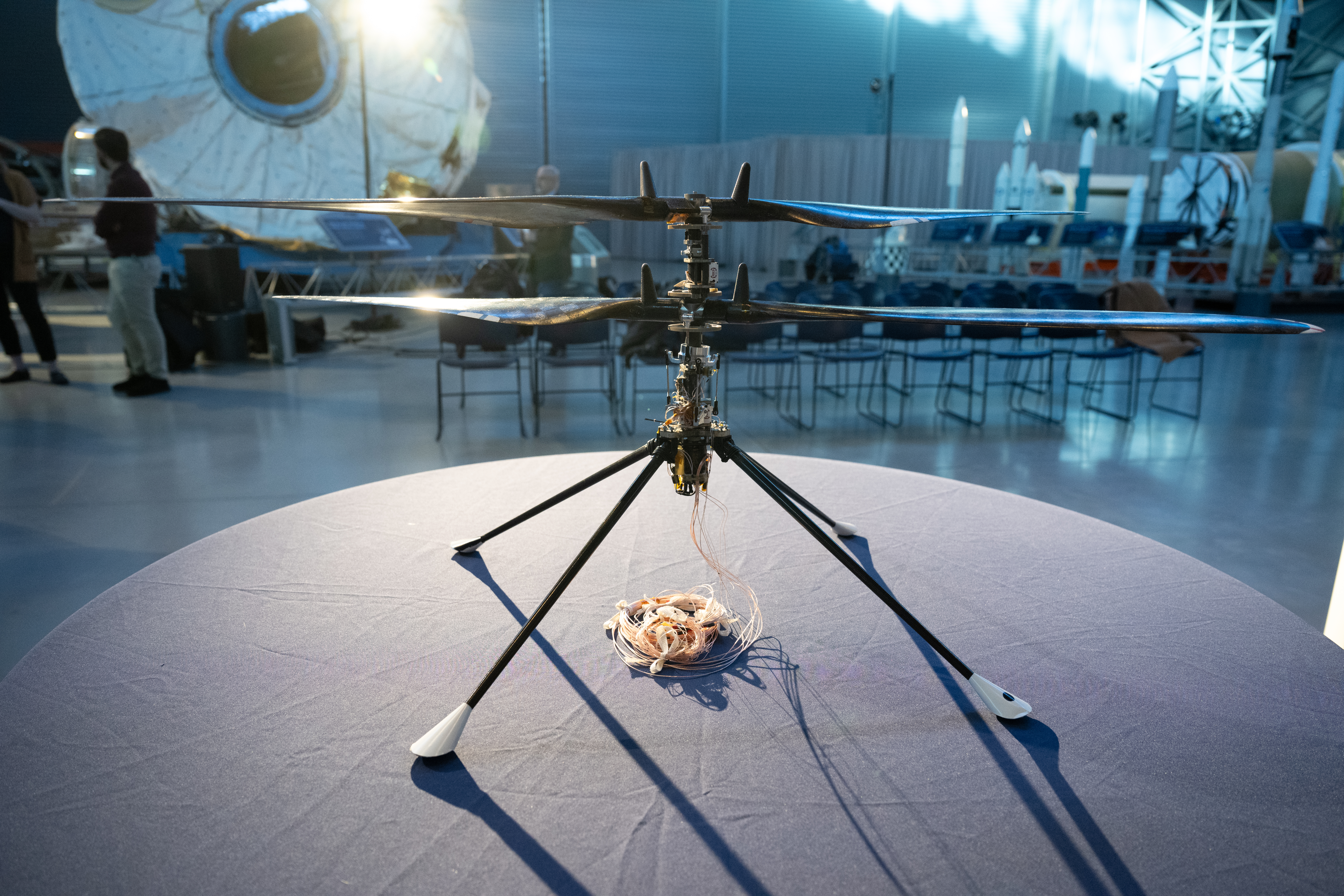 The aerial prototype of the Ingenuity Mars Helicopter is seen at the Smithsonian National Air and Space Museum’s Steve F. Udvar-Hazy Center, Friday, Dec. 15, 2023, in Chantilly, Va. The prototype, which was the first to demonstrate it was possible to fly in a simulated Mars environment at NASA’s Jet Propulsion Laboratory (JPL), was donated to the museum on Friday. Photo Credit: (NASA/Joel Kowsky)