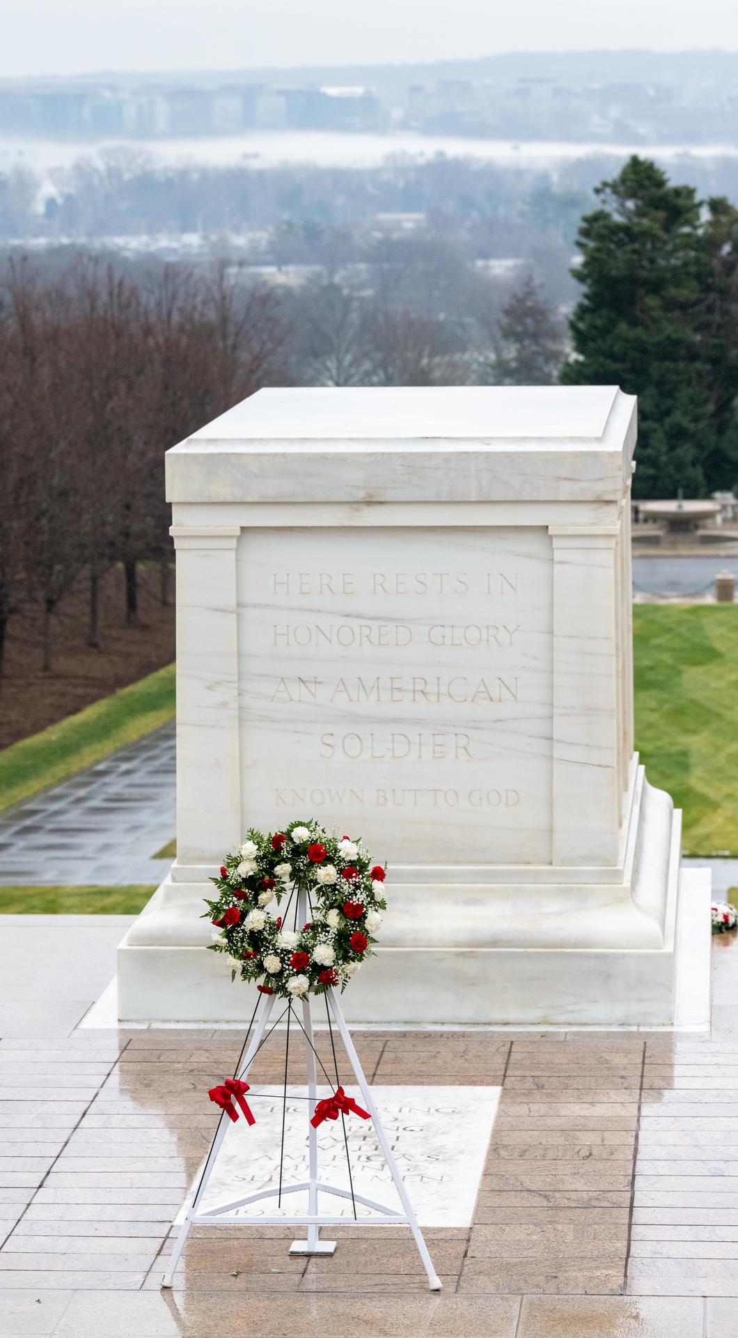 A wreath placed by NASA Administrator Bill Nelson and NASA Deputy Administrator Pam Melroy is seen at the Tomb of the Unknowns as part of NASA's Day of Remembrance, Thursday, Jan. 25, 2024, at Arlington National Cemetery in Arlington, Va. The wreaths were laid in memory of those men and women who lost their lives in the quest for space exploration. Photo Credit: (NASA/Keegan Barber)