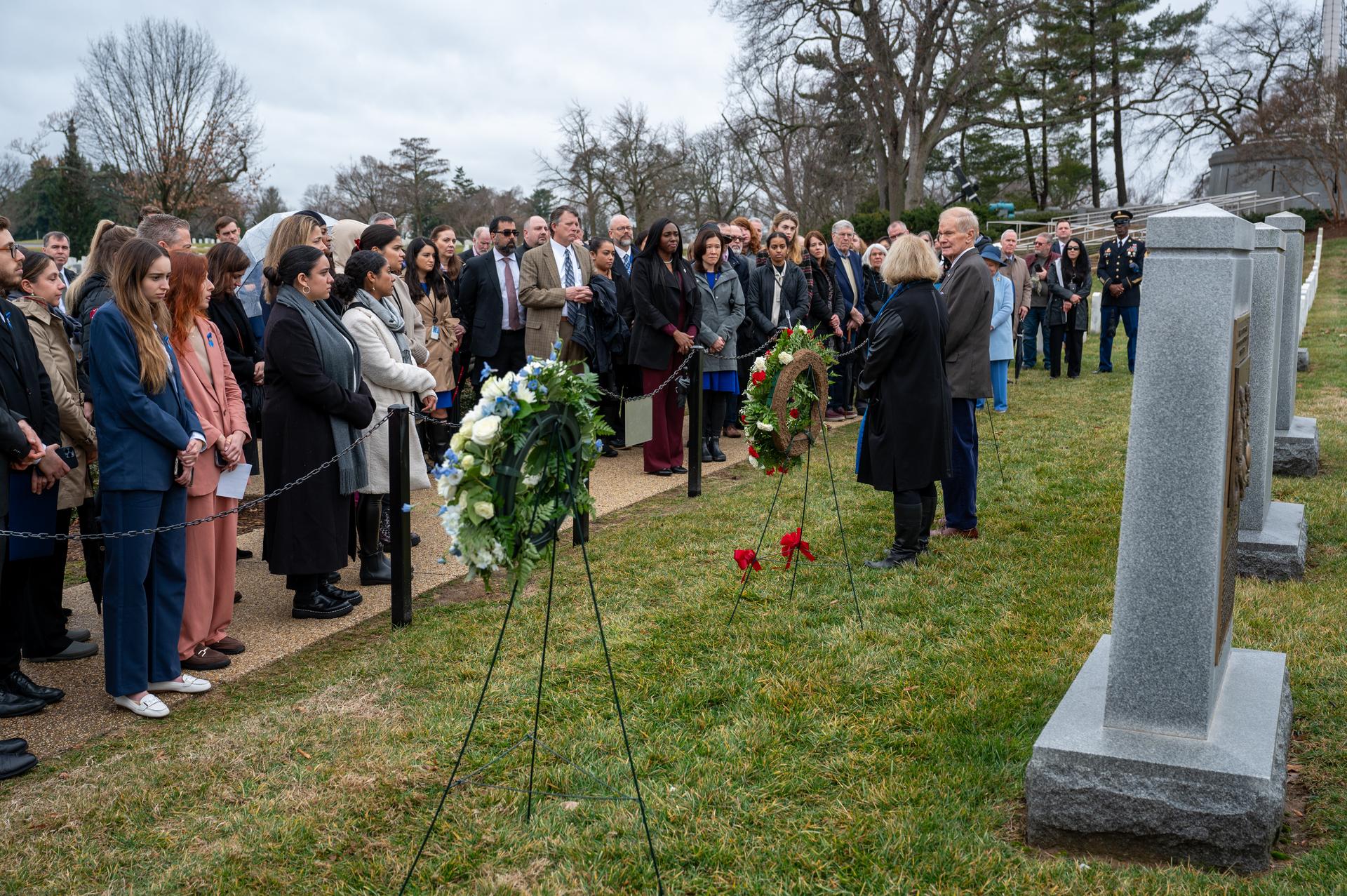 NASA Administrator Bill Nelson and NASA Deputy Administrator Pam Melroy deliver remarks at the Space Shuttle Columbia and Space Shuttle Challenger Memorial’s during a wreath laying ceremony that was part of NASA's Day of Remembrance, Thursday, Jan. 25, 2024, at Arlington National Cemetery in Arlington, Va. The wreaths were laid in memory of those men and women who lost their lives in the quest for space exploration. Photo Credit: (NASA/Keegan Barber)