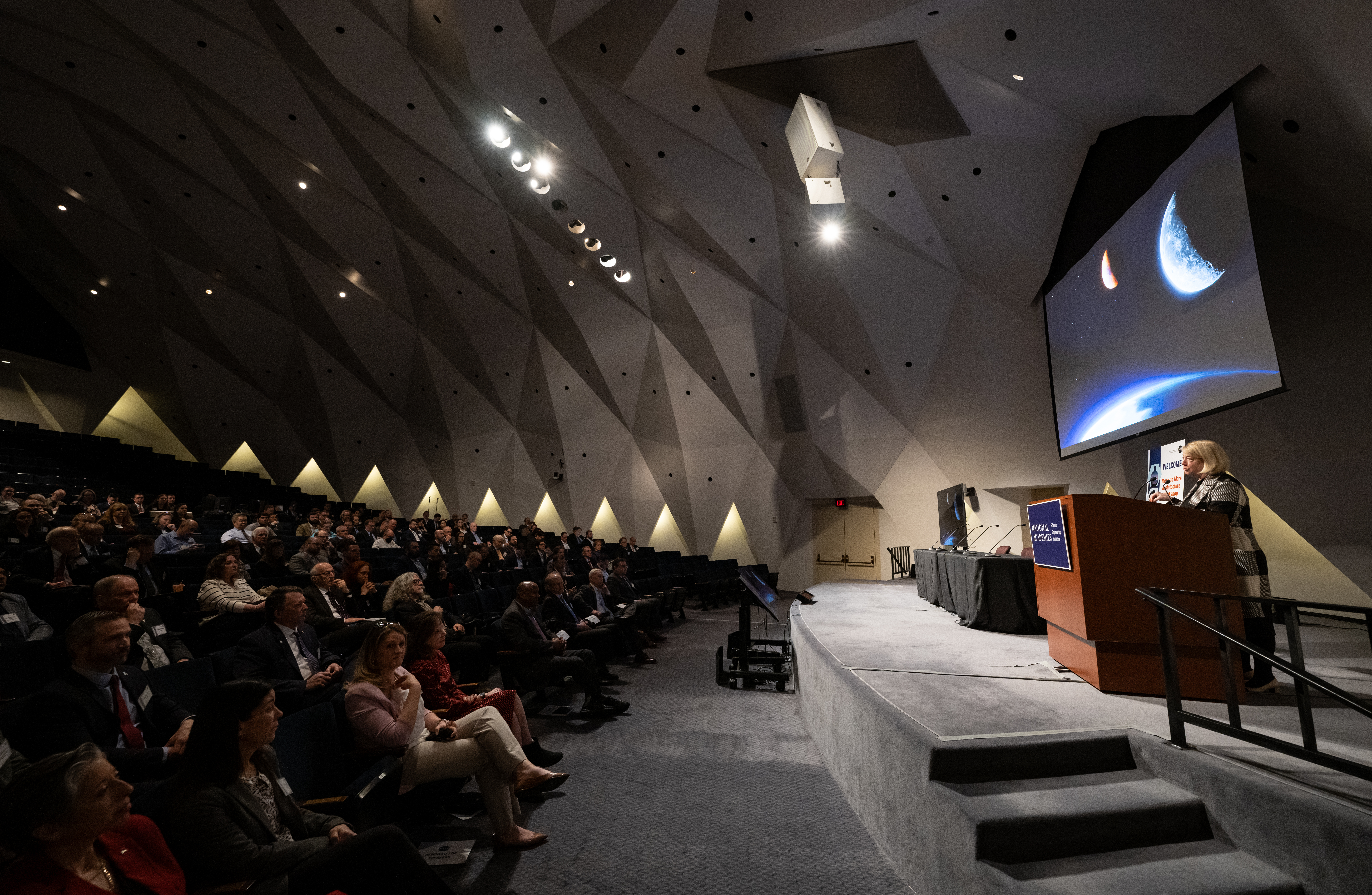 NASA Deputy Administrator Pam Melroy gives opening remarks at the Moon to Mars Architecture Workshop, Thursday, Feb. 22, 2024, at the National Academy of Sciences in Washington. NASA held the workshop to engage the broader space community and collect feedback from U.S. industry and academia and international partners to inform NASA's Moon to Mars Architecture, the agency's roadmap for human exploration of the Moon and Mars.