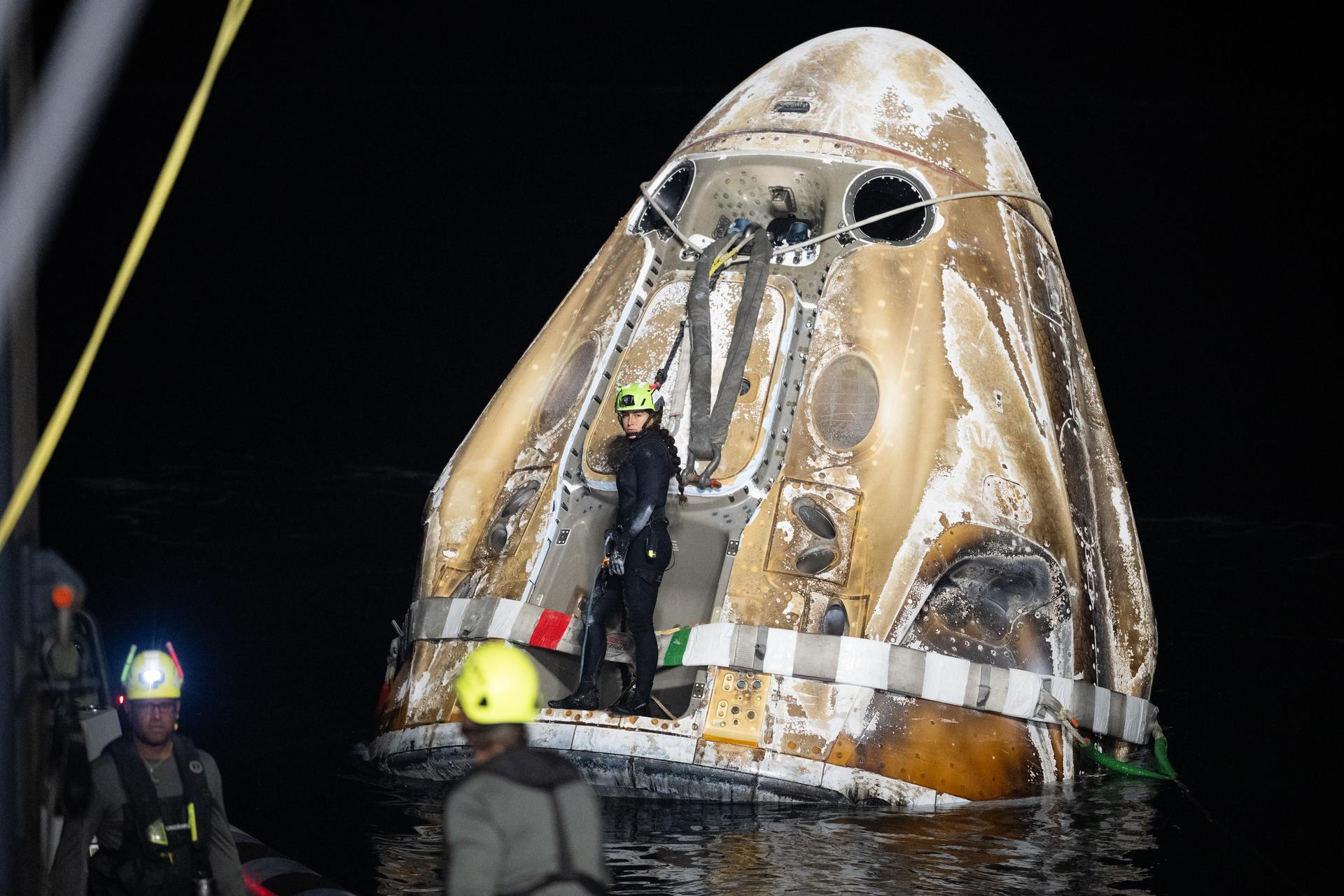 Support teams work around the SpaceX Dragon Endurance spacecraft shortly after it landed with NASA astronaut Jasmin Moghbeli, ESA (European Space Agency) astronaut Andreas Mogensen, Japan Aerospace Exploration Agency (JAXA) astronaut Satoshi Furukawa, and Roscosmos cosmonaut Konstantin Borisov aboard in the Gulf of Mexico off the coast of Pensacola, Florida, Tuesday, March 12,2024. Moghbeli, Mogensen, Furukawa, and Borisov are returning after nearly six-months in space as part of Expedition 70 aboard the International Space Station. Photo Credit: (NASA/Joel Kowsky)