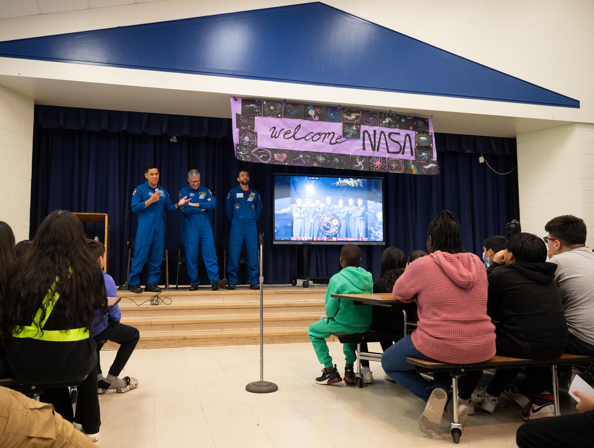 NASA astronauts Frank Rubio, left, and Stephen Bowen and UAE (United Arab Emirates) astronaut Sultan Alneyadi speak to students at Rolling Terrace Elementary School, Friday, March 22, 2024, in Takoma Park, Maryland. Bowen and Alneyadi spent 186 days aboard the International Space Station as part of Expedition 69; while Rubio set a new record for the longest single spaceflight by a U.S. astronaut, spending 371 days in orbit on an extended mission spanning Expeditions 68 and 69. Photo Credit: (NASA/Joel Kowsky)