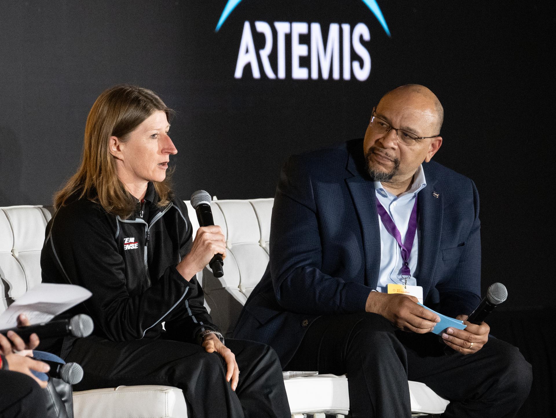 Andrea Mueller, engineer at Team Penske, left, speaks to students about careers in STEM during a panel discussion at the Shell Eco-marathon Americas alongside Torry Johnson, deputy associate administrator for STEM Engagement in NASA's Office of STEM Engagement, Thursday, April 4, 2024, at the Indianapolis Motor Speedway in Indianapolis, Ind. Photo Credit: (NASA/Joel Kowsky)