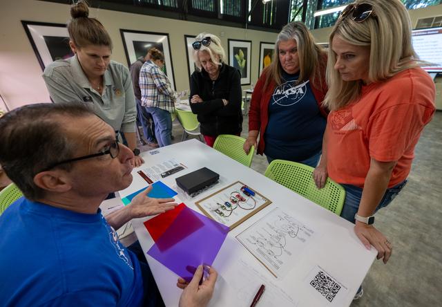 NASA Heliophysics Science Division Instrument Systems Engineer Patrick Haas, left, demonstrates heliophysics activities during a teacher professional development event hosted by the NASA Heliophysics Education Activation Team (HEAT) at the Dallas Arboretum, Saturday, April 6, 2024, in Dallas, Texas. Photo Credit: (NASA/Keegan Barber)