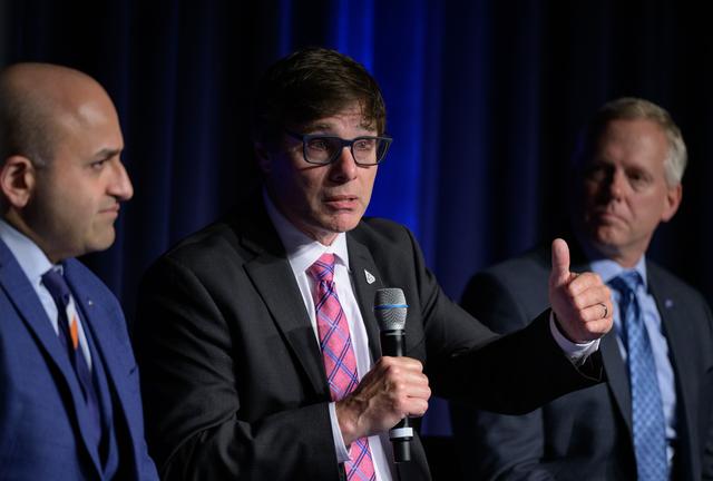NASA Chief Artificial Intelligence Officer David Salvagnini gives remarks in a NASA employee town hall on how the agency is using and developing Artificial Intelligence (AI) tools to advance missions and research, as NASA Chief Technologist A.C. Charania, left and NASA Chief Information Officer Jeff Seaton, right, look on, Wednesday, May 22, 2024, at the NASA Headquarters Mary W. Jackson Building in Washington. Photo Credit: (NASA/Bill Ingalls)