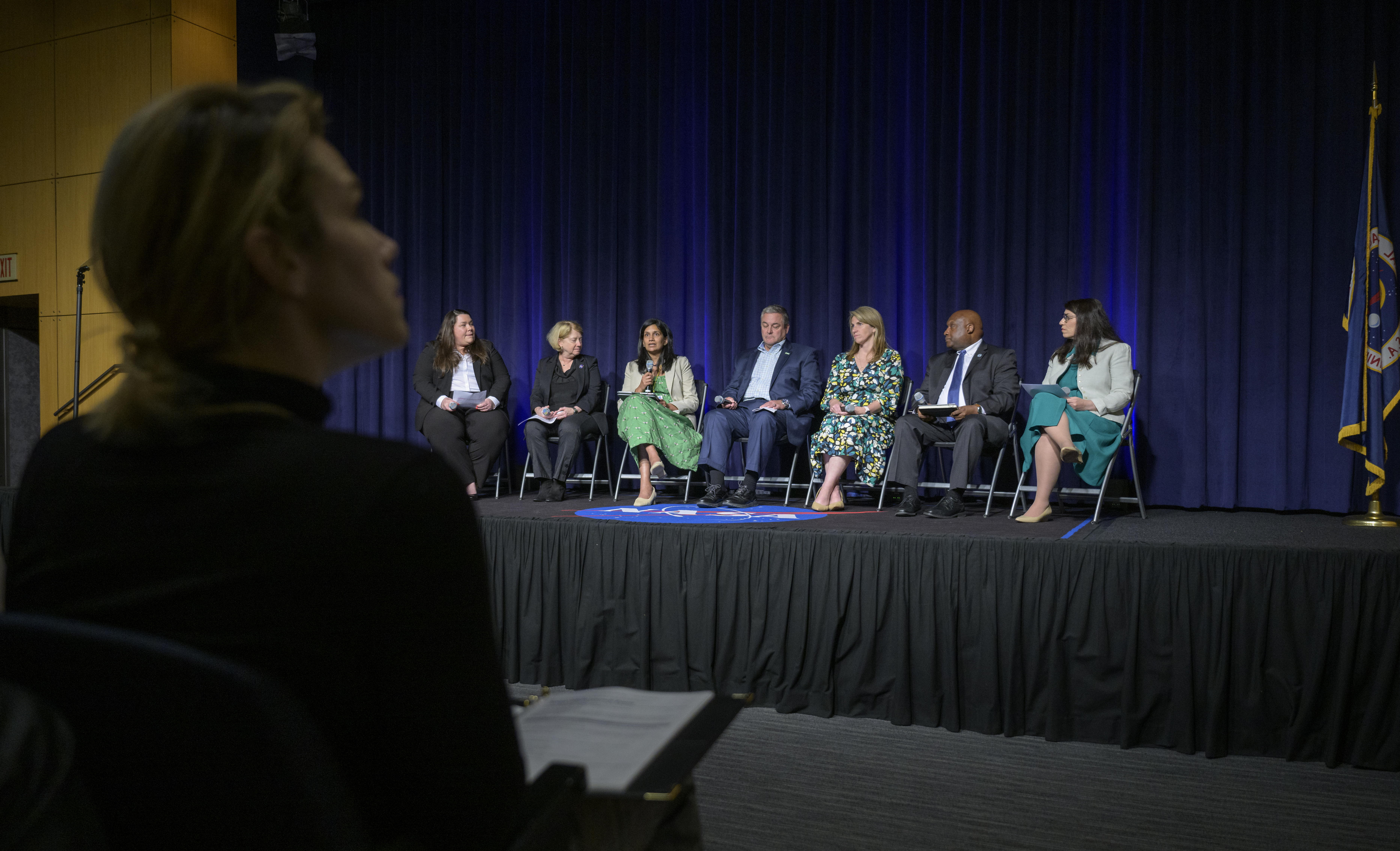 NASA Disasters Program Manager Shanna McClain, left, NASA Deputy Administrator Pam Melroy, National Oceanic and Atmospheric Administration Deputy Administrator Jainey Bavishi, U.S. Geological Survey Associate Director of Natural Hazards Mission Area Michael Grimm, USAID Deputy Assistant to the Administrator for Bureau for Humanitarian Assistance Dianna Darsney de Salcedo, Federal Emergency Management Agency Deputy Administrator Erik Hooks, and National Institute of Standards and Technology Senior Scientist Judith Mitrani-Reiser, right, participate in event launching a new Disaster Response Coordination System that will provide communities and organizations around the world with access to science and data to aid disaster response, Thursday, June 13, 2024, at the NASA Headquarters Mary W. Jackson Building in Washington. Photo Credit: (NASA/Bill Ingalls)