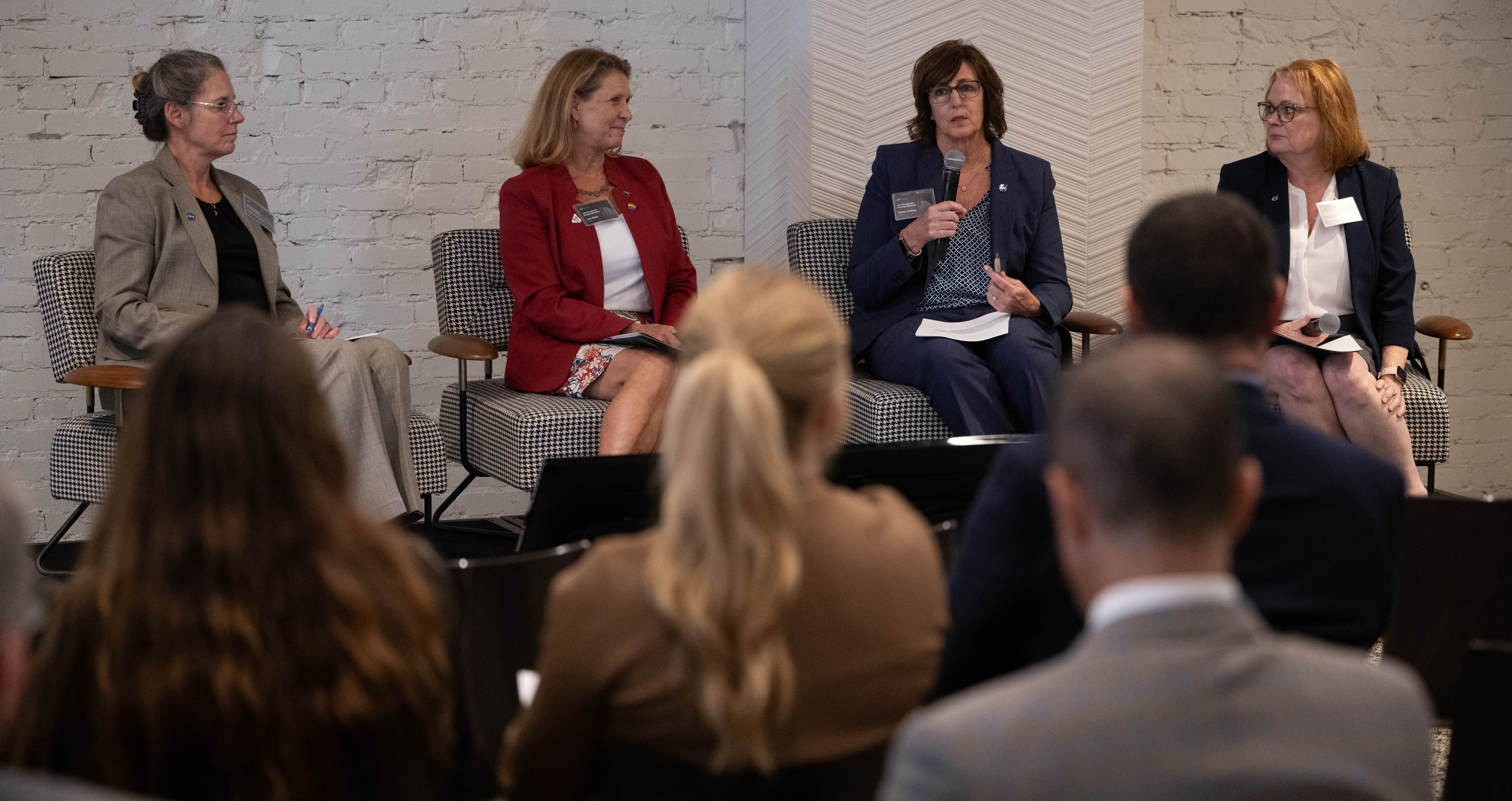 Sandra Connelly, deputy associate administrator for NASA’s Science Mission Directorate, left, Lori Glaze, acting deputy associate administrator for NASA’s Exploration Systems Development Mission Directorate, Robyn Gatens, director of the International Space Station at NASA Headquarters, and Carrie Olsen, manager of the Next Gen STEM project for NASA’s Office of STEM Engagement, discuss key takeaways at the conclusion of NASA’s LEO Microgravity Strategy Industry and Academia Workshop, Friday, Sept. 13, 2024, at Convene in Washington. NASA’s LEO Microgravity Strategy effort aims to develop and document an objectives-based approach toward the next generation of human presence in low Earth orbit to advance microgravity science, technology, and exploration. Photo Credit: (NASA/Joel Kowsky)