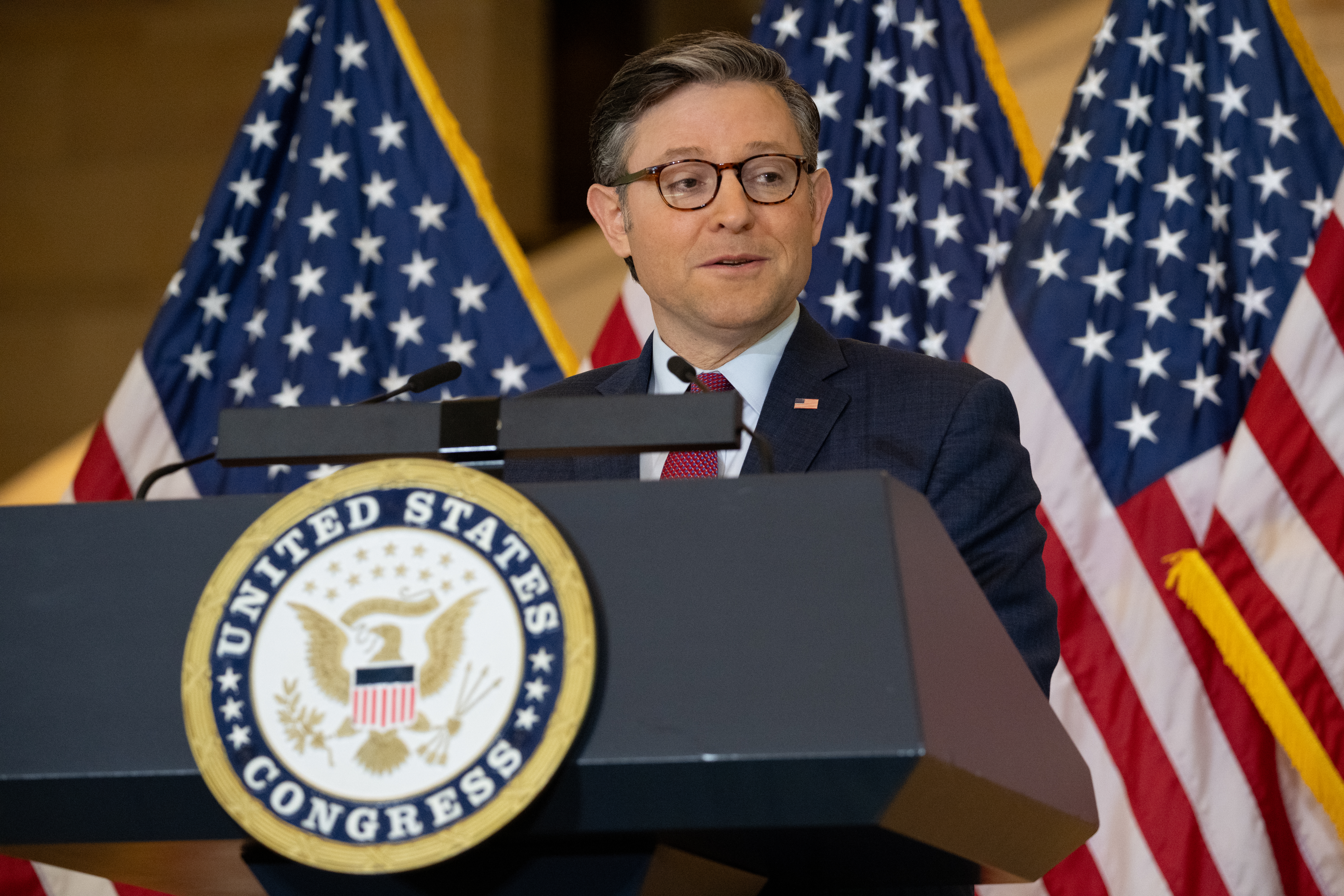 Speaker of the House Mike Johnson (R-LA), delivers opening remarks during a Congressional Gold Medal ceremony recognizing NASA’s Hidden Figures, Wednesday, Sept. 18, 2024, in Emancipation Hall at the U.S. Capitol in Washington. Congressional Gold Medals were awarded to Katherine Johnson, Dr. Christine Darden, Dorothy Vaughan, and Mary W. Jackson in recognition of their service to the United States as well as a Congressional Gold Medal in recognition of all the women who served as computers, mathematicians, and engineers at the National Advisory Committee for Aeronautics and NASA between the 1930s and 1970s. Photo Credit: (NASA/Joel Kowsky)