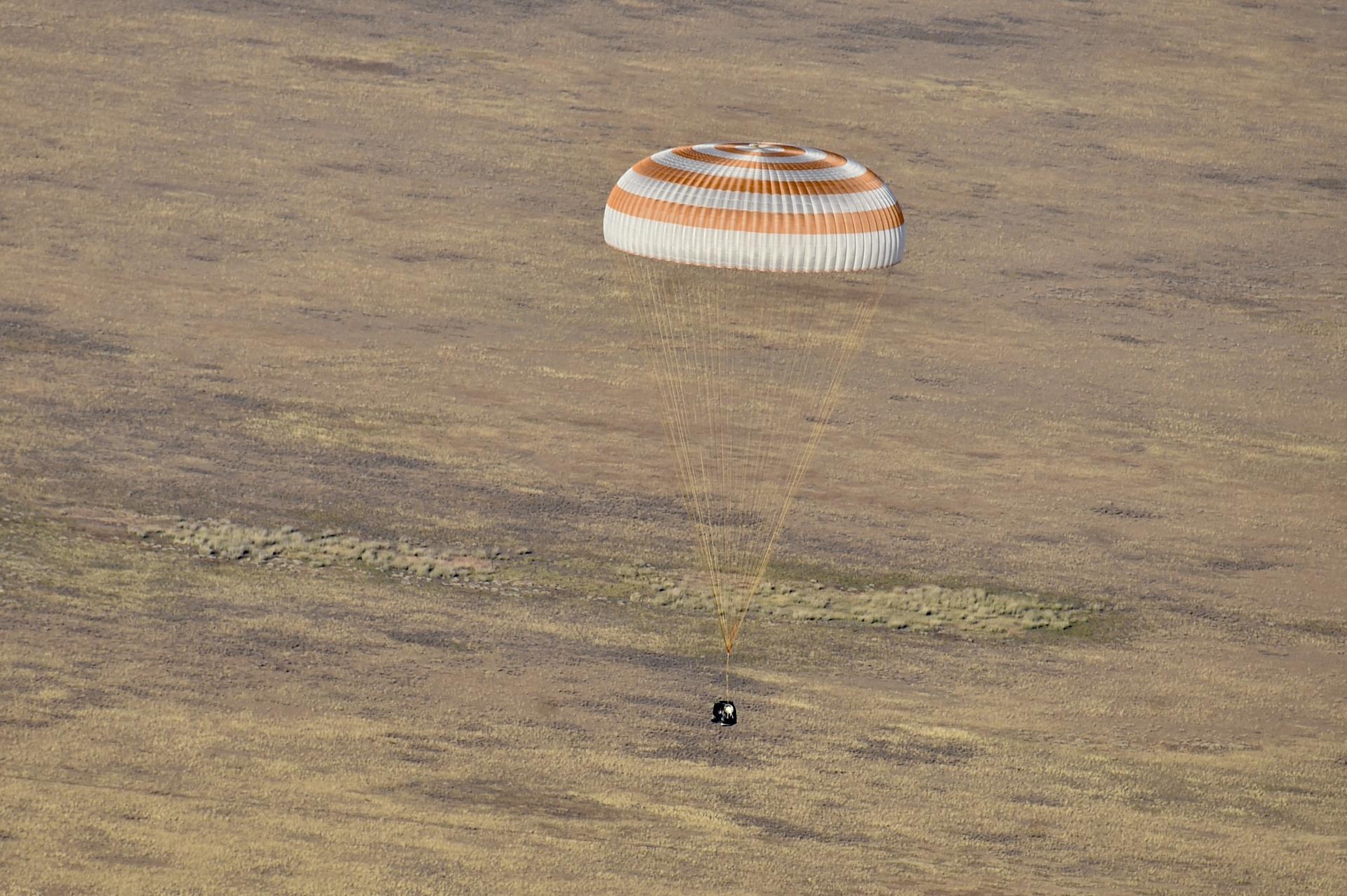 The Soyuz MS-25 spacecraft is seen as it lands in a remote area near the town of Zhezkazgan, Kazakhstan with Expedition 71 NASA astronaut Tracy C. Dyson, and Roscosmos cosmonauts Nikolai Chub and Oleg Kononenko, Monday, Sept. 23, 2024. Dyson is returning to Earth after logging 184 days in space as a member of Expeditions 70-71 aboard the International Space Station and Chub and Kononenko return after having spent the last 374 days in space. Photo Credit: (NASA/GCTC/Pavel Shvets)