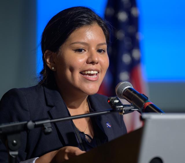 NASA Public Engagement Advisor Sol Ortega moderates an event where NASA and the Hispanic Heritage Foundation signed a Space Act Agreement to collaborate and expand STEM opportunities for Latino K-12 and university students and reduce barriers to agency activities and opportunities, Monday, Sept. 30, 2024, at the NASA Headquarters Mary W. Jackson Building in Washington. Photo Credit: (NASA/Bill Ingalls)