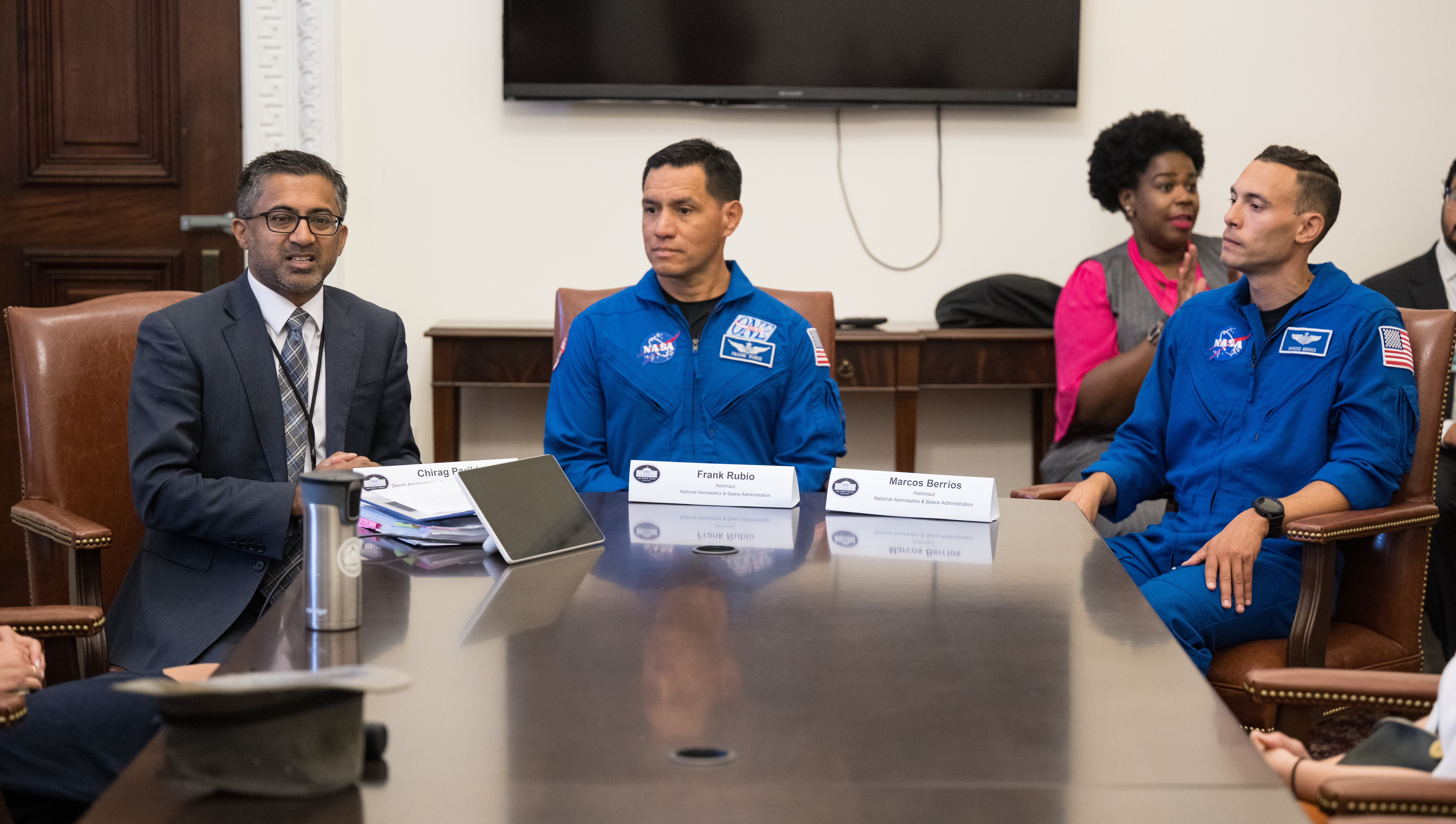 Chirag Parikh, Deputy Assistant to the President and Executive Secretary of the National Space Council, introduces NASA Astronauts Frank Rubio, center, and Marcos Berrios, at a staff engagement event that took place during a White House Hispanic Heritage month event titled “Soaring Together: Inspiring the Next Generation of Space Leaders” at the Eisenhower Executive Office Building, Monday, Sept. 30, 2024 in Washington. Photo Credit: (NASA/Aubrey Gemignani)
