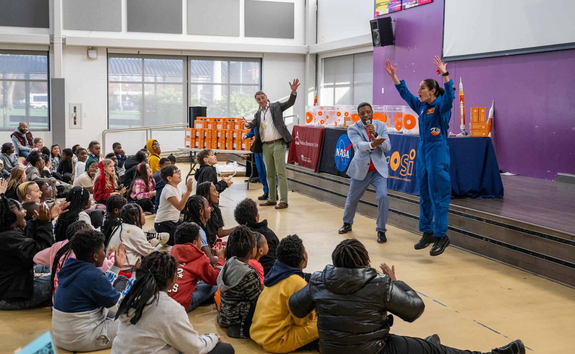 NASA astronaut Jasmin Moghbeli engages with students during an event at Catherine Watkins Elementary School Monday, Dec. 2, 2024 in Washington. O’Hara and Moghbeli spent six months in space as part of Expedition 70 aboard the International Space Station. Photo Credit: (NASA/Keegan Barber)