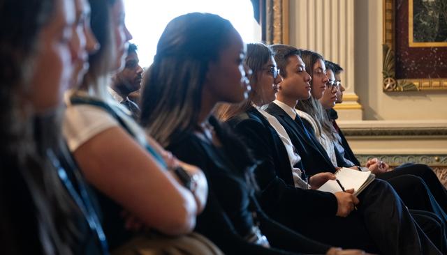 White House staff and interns listen to NASA astronauts Jasmin Moghbeli and Loral O’Hara during a fireside chat, Wednesday, Dec. 4, 2024 at the Eisenhower Executive Office Building in Washington. O’Hara and Moghbeli spent six months in space as part of Expedition 70 aboard the International Space Station. Photo Credit: (NASA/Joel Kowsky)