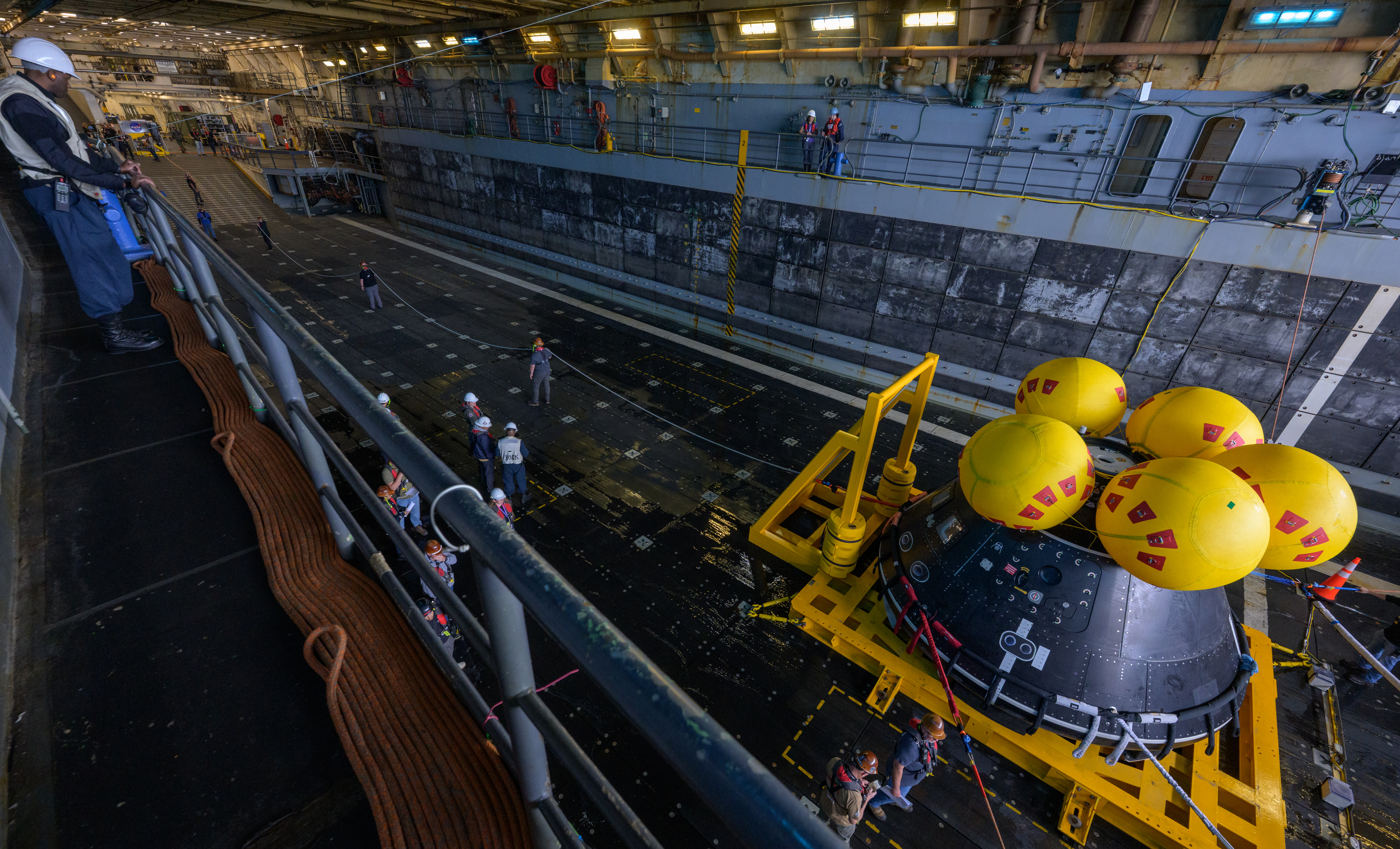 Teams work on the Crew Module Test Article (CMTA), a full scale mockup of the Orion spacecraft, as it sits sits nestled in its cradle during Underway Recovery Test-12 onboard USS Somerset off the coast of California, Wednesday, March 26, 2025. During the test, NASA and Department of Defense teams are practicing to ensure recovery procedures are validated as NASA plans to send Artemis II astronauts around the Moon and splashdown in the Pacific Ocean. Photo Credit: (NASA/Bill Ingalls)