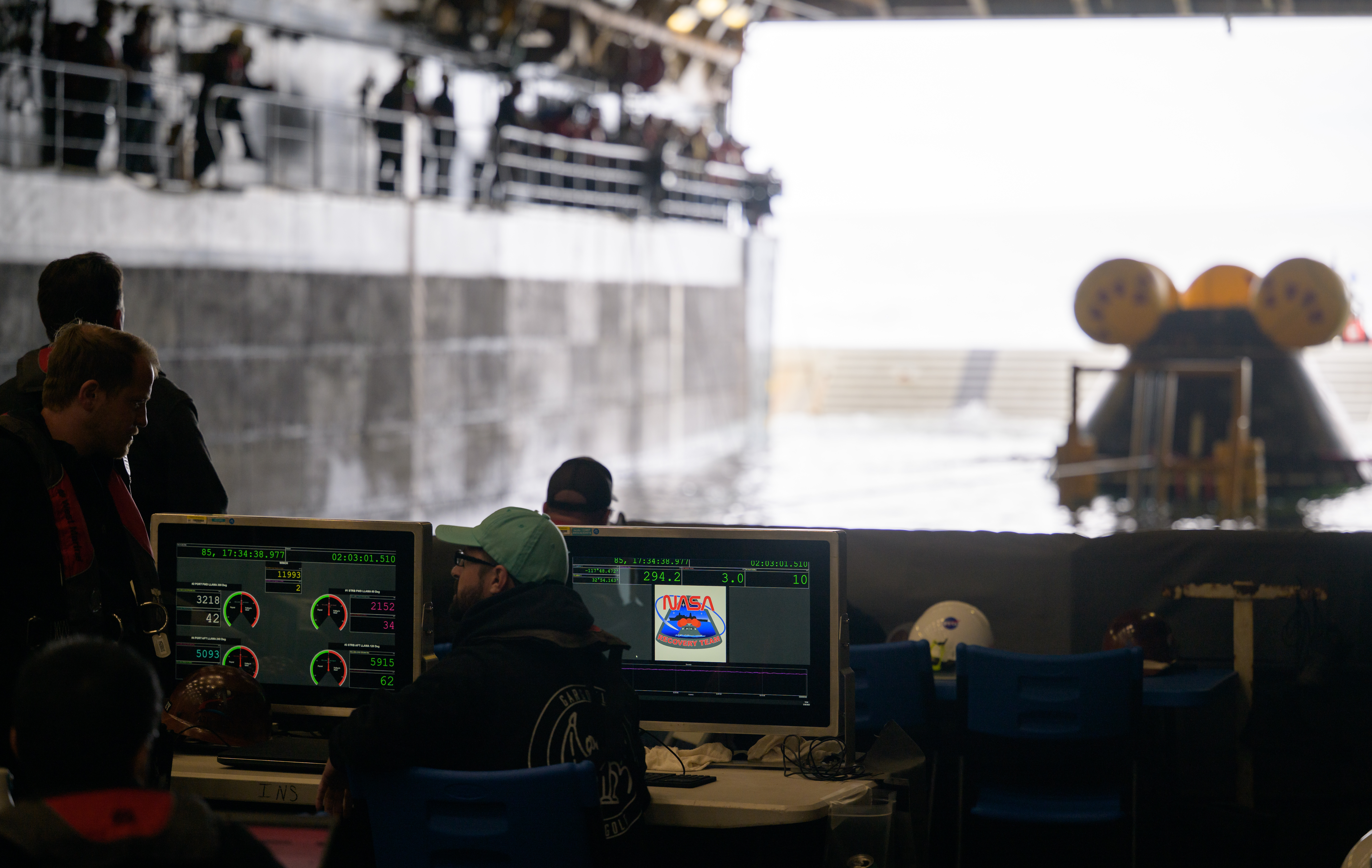 Teams gather as they prepare the Crew Module Test Article (CMTA), a full scale mockup of the Orion spacecraft, during the Underway Recovery Test-12 onboard USS Somerset off the coast of California, Wednesday, March 26, 2025. During the test, NASA and Department of Defense teams are practicing to ensure recovery procedures are validated as NASA plans to send Artemis II astronauts around the Moon and splashdown in the Pacific Ocean. Photo Credit: (NASA/Joel Kowsky)