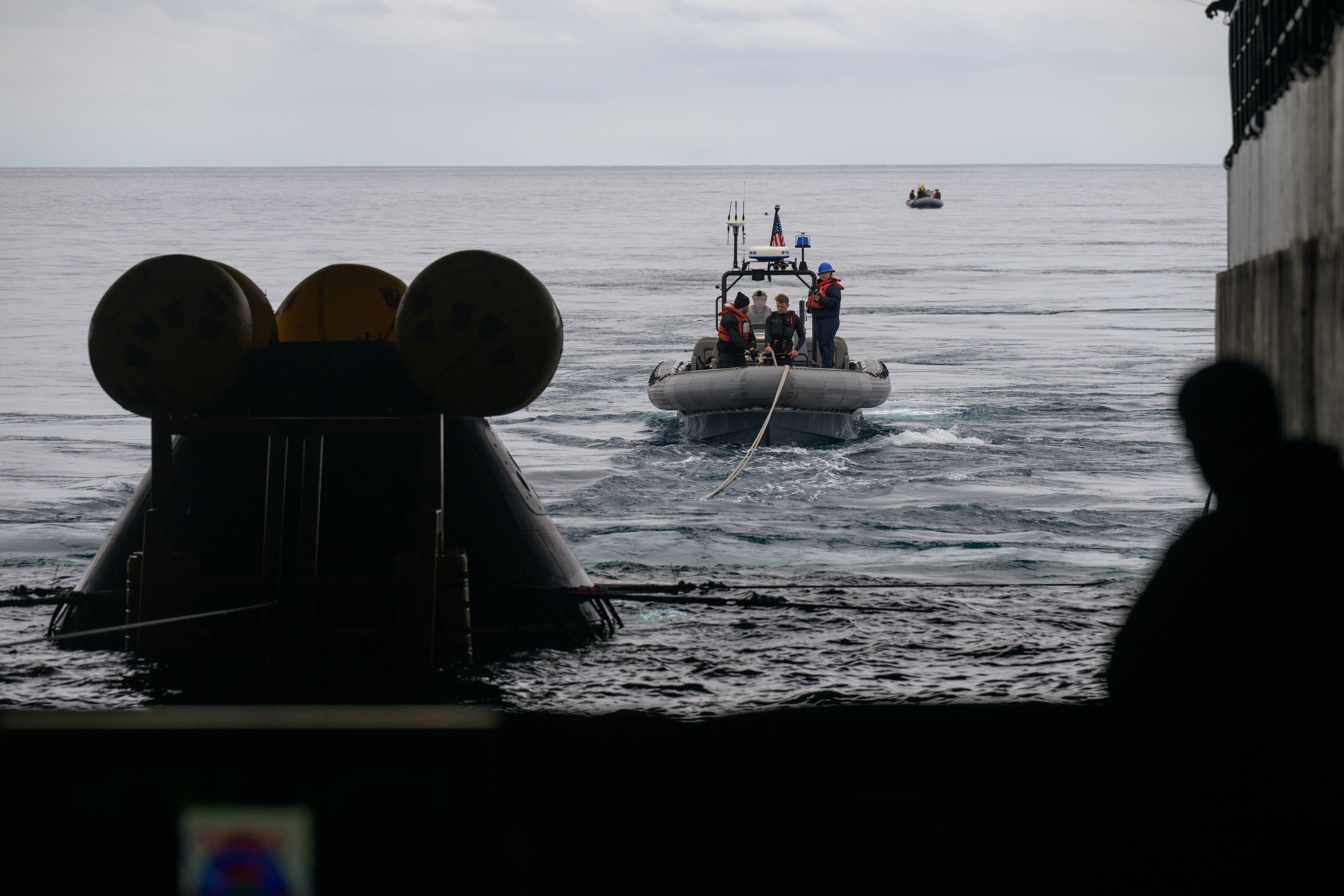 The Crew Module Test Article (CMTA), a full scale mockup of the Orion spacecraft, is seen during Underway Recovery Test-12 onboard USS Somerset off the coast of California, Wednesday, March 26, 2025. During the test, NASA and Department of Defense teams are practicing to ensure recovery procedures are validated as NASA plans to send Artemis II astronauts around the Moon and splashdown in the Pacific Ocean. Photo Credit: (NASA/Bill Ingalls)
